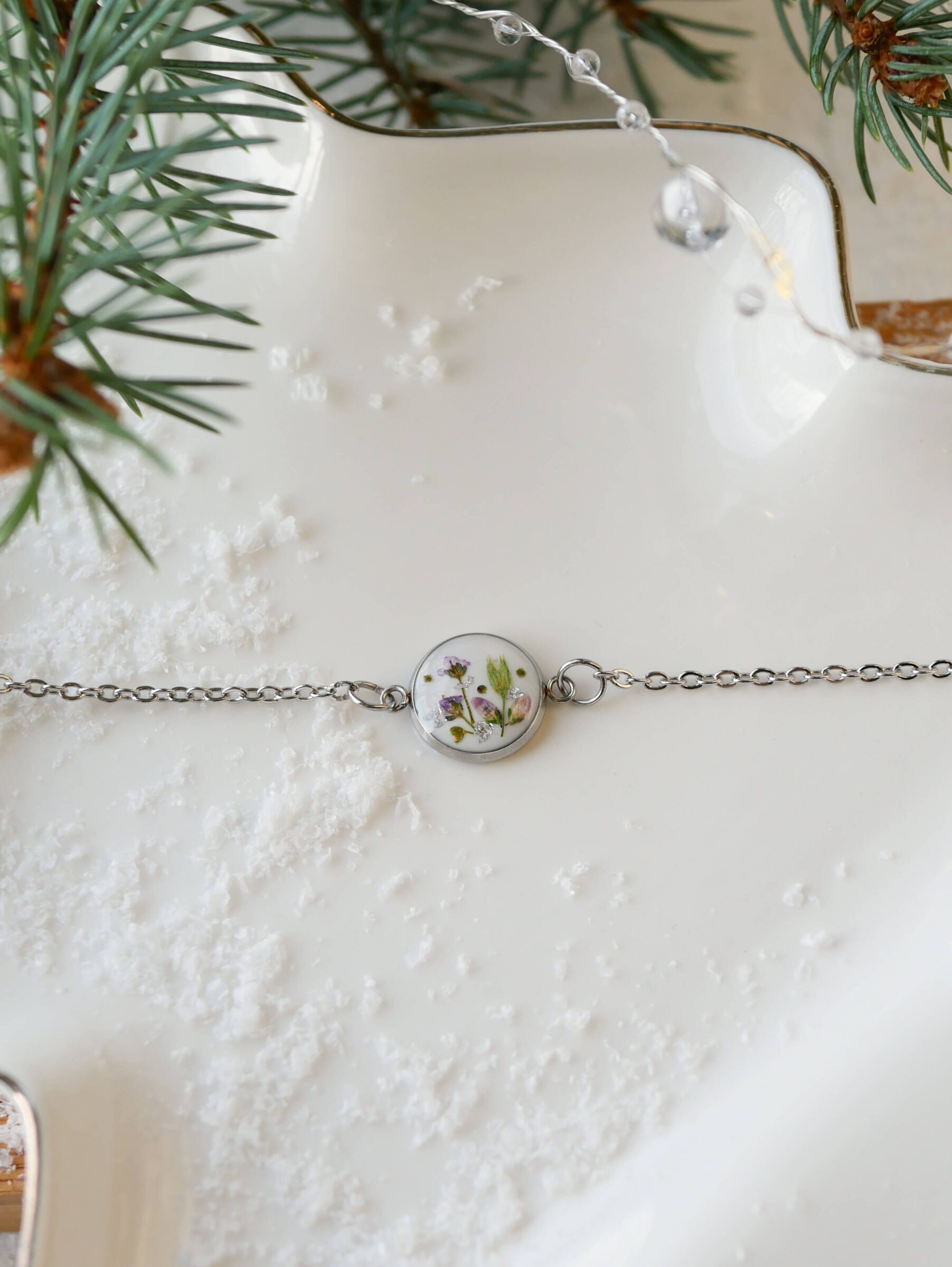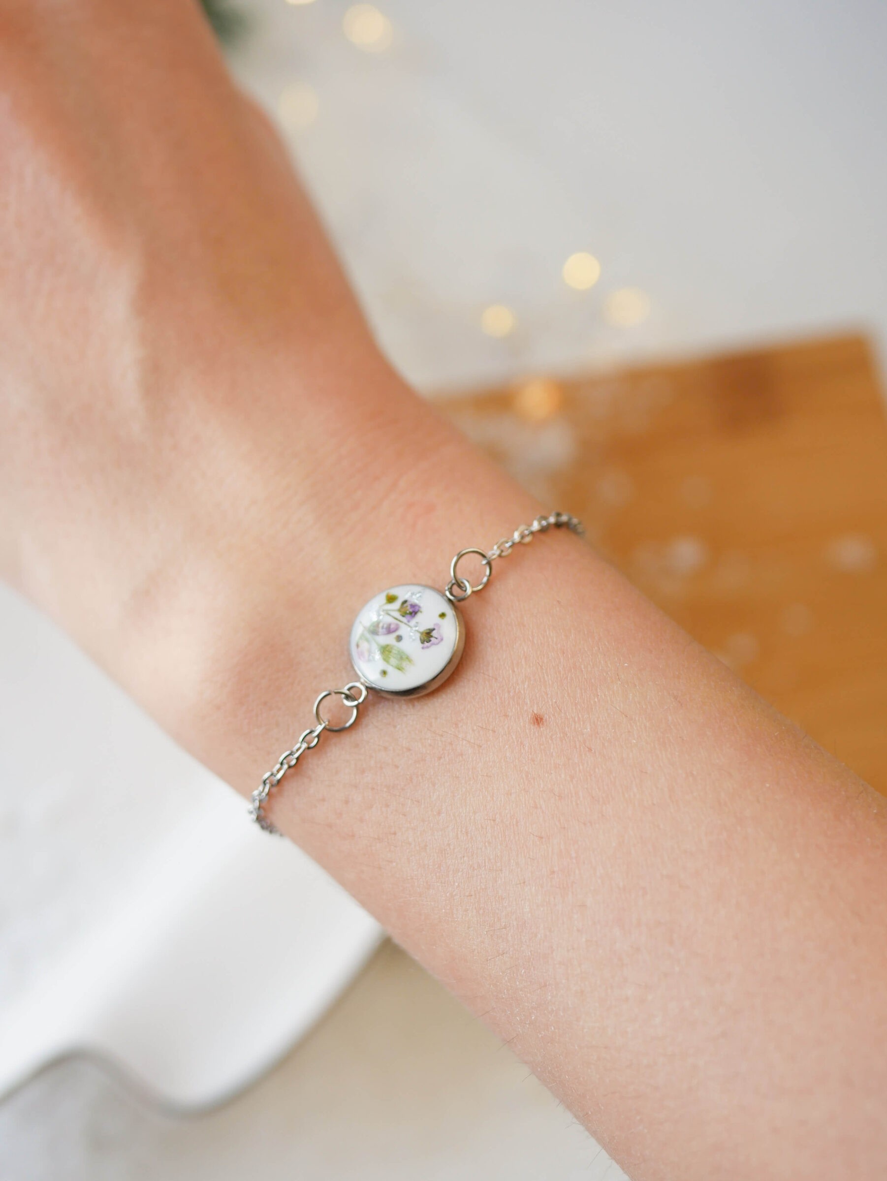 Bransoletka z łąką smagliczek na mlecznym tle z drobinkami srebra.