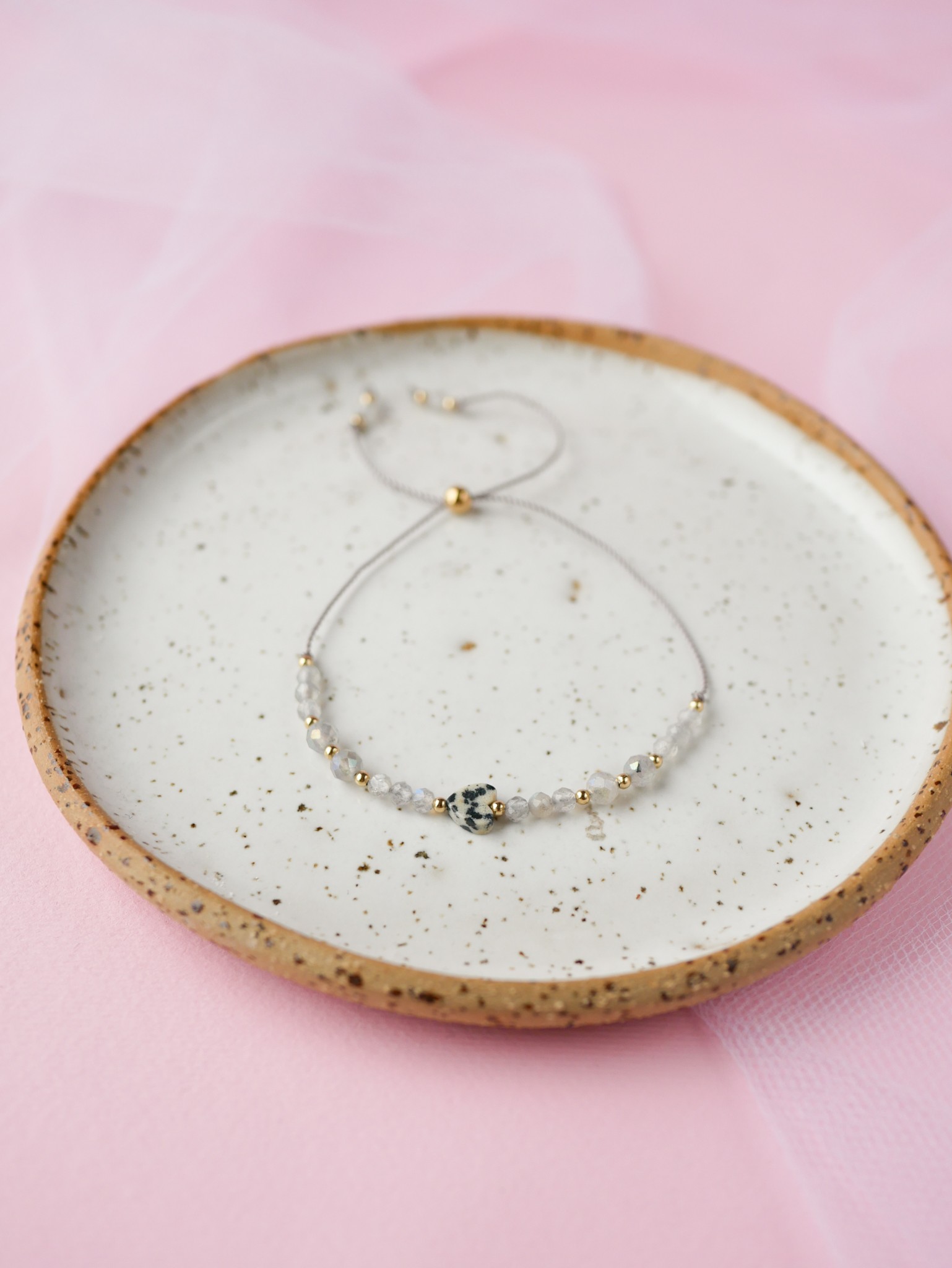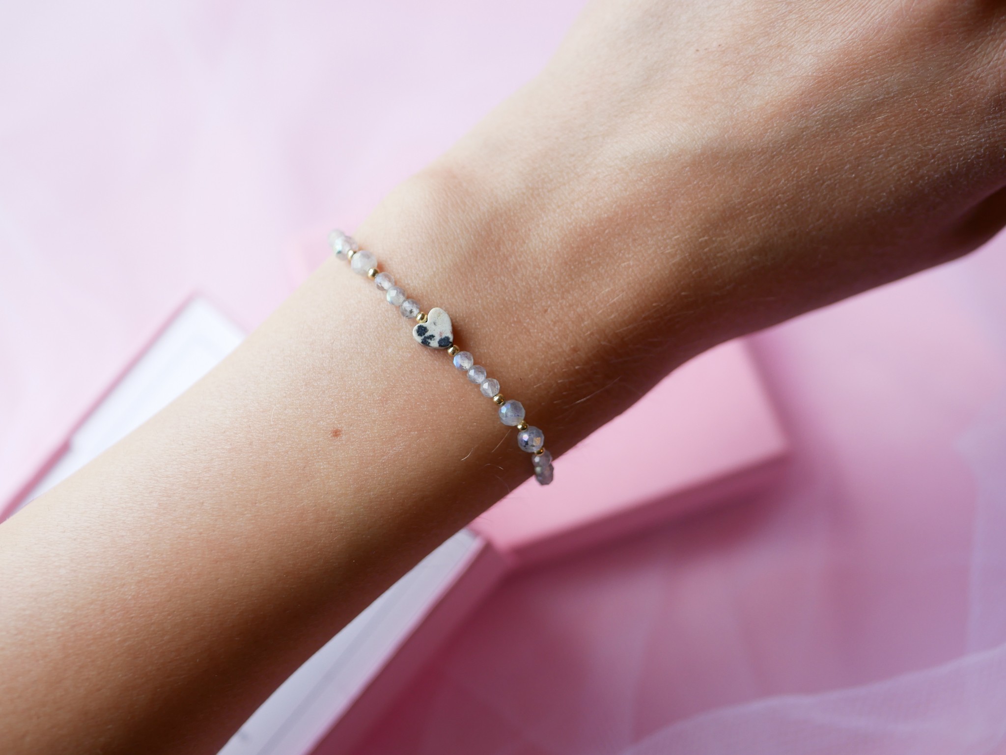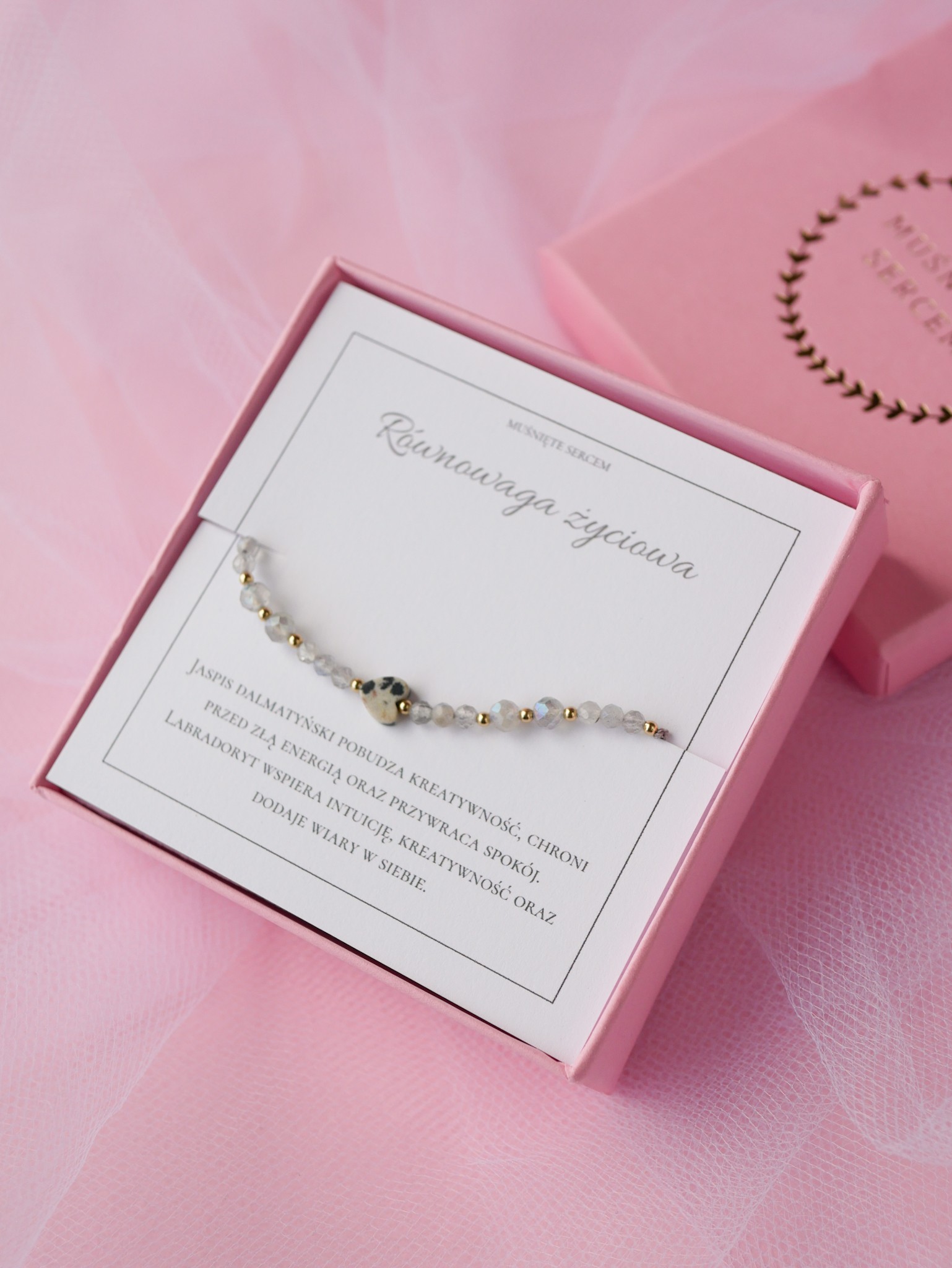 Serce na środku bransoletki jest wykonane z jaspisu dalmatyńskiego, kamienie obok to labradoryty.