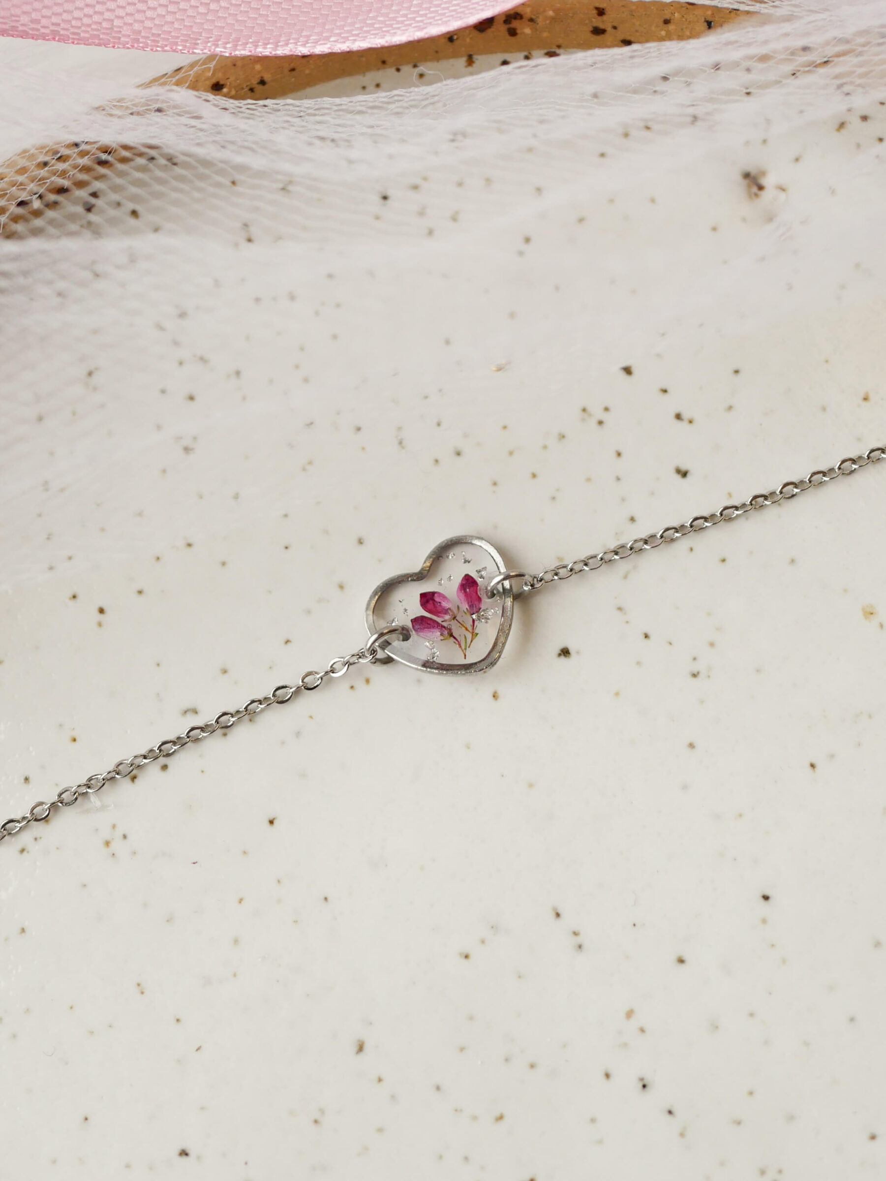 Bransoletka serduszko z wrzoścem i z drobinkami srebra.