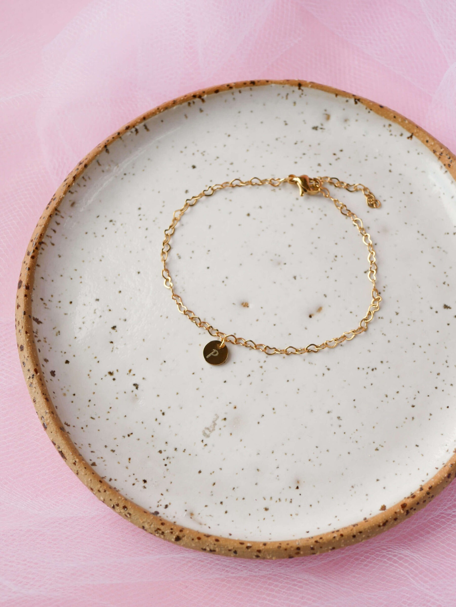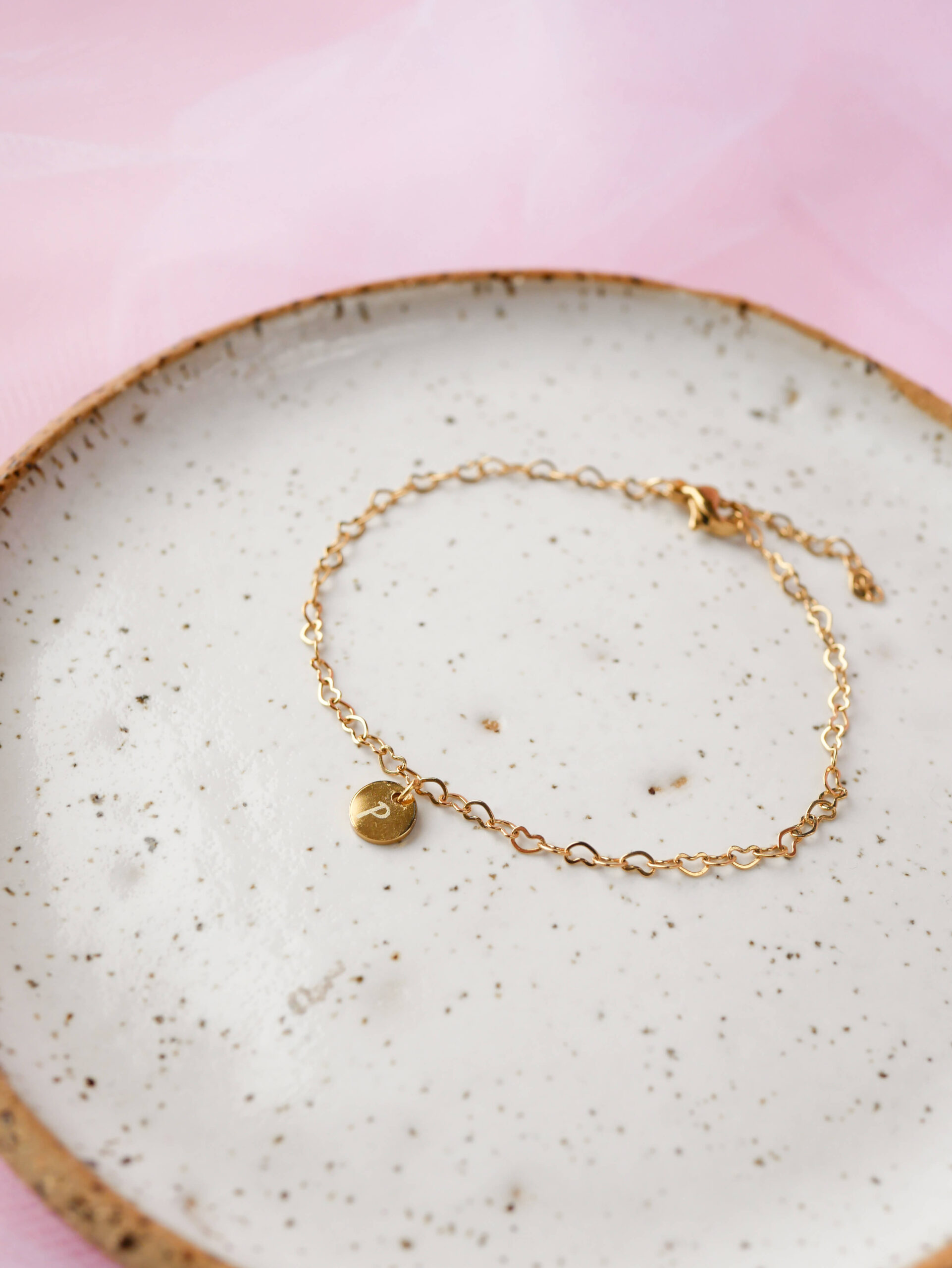 Minimalistyczna bransoletka z grawerowanym inicjałem na eleganckim kółeczku, łańcuszek w kształcie serduszek.