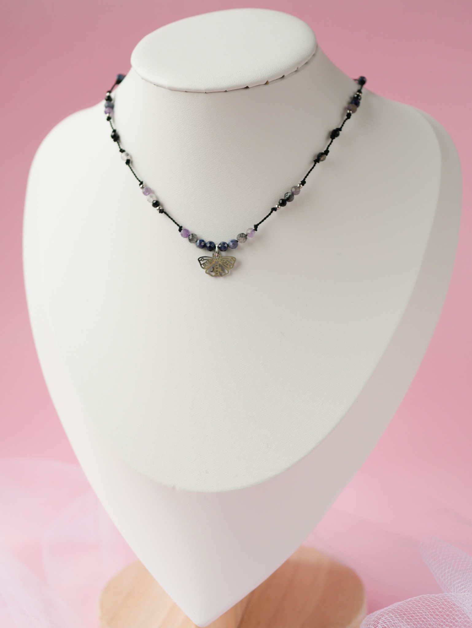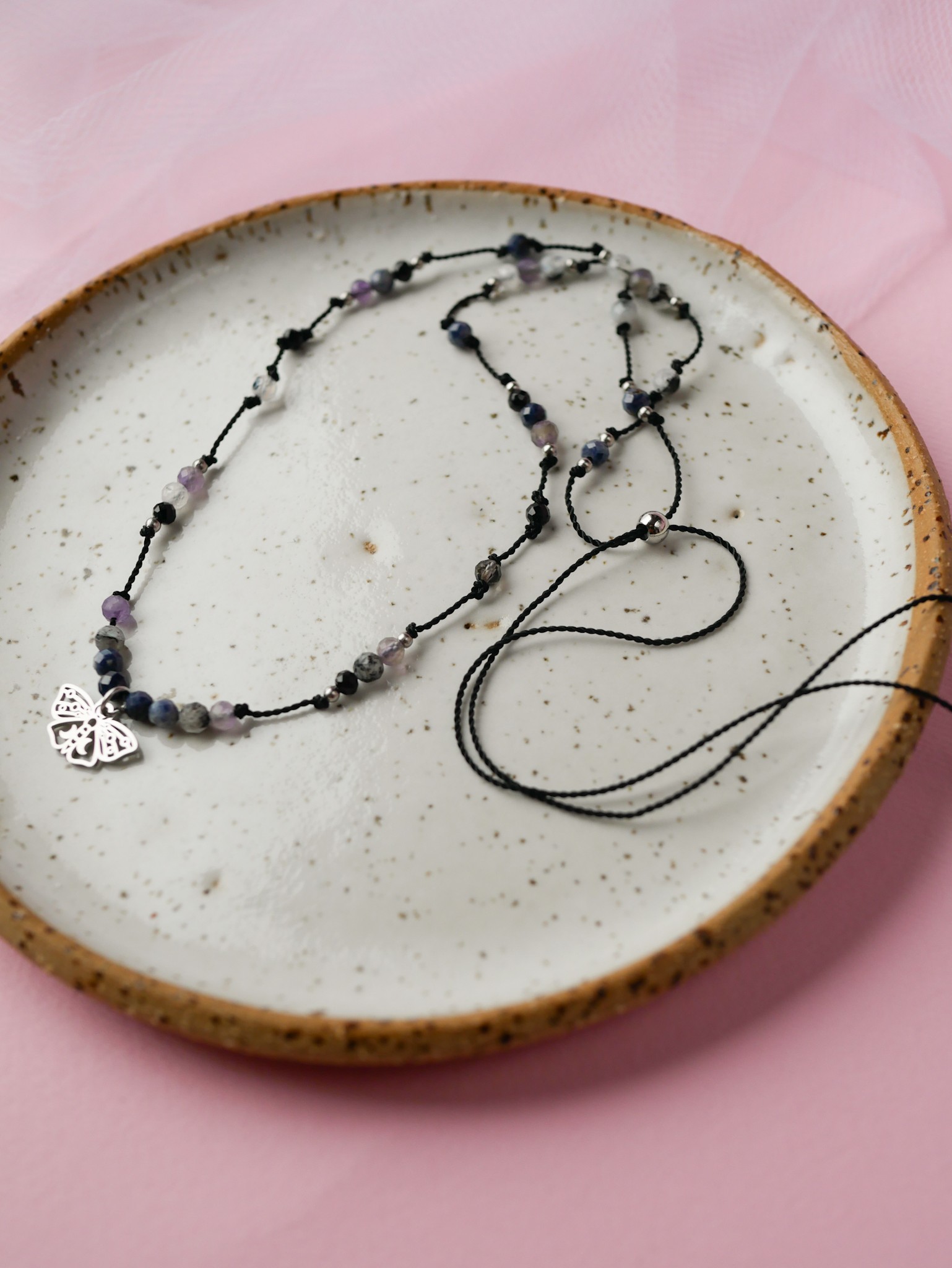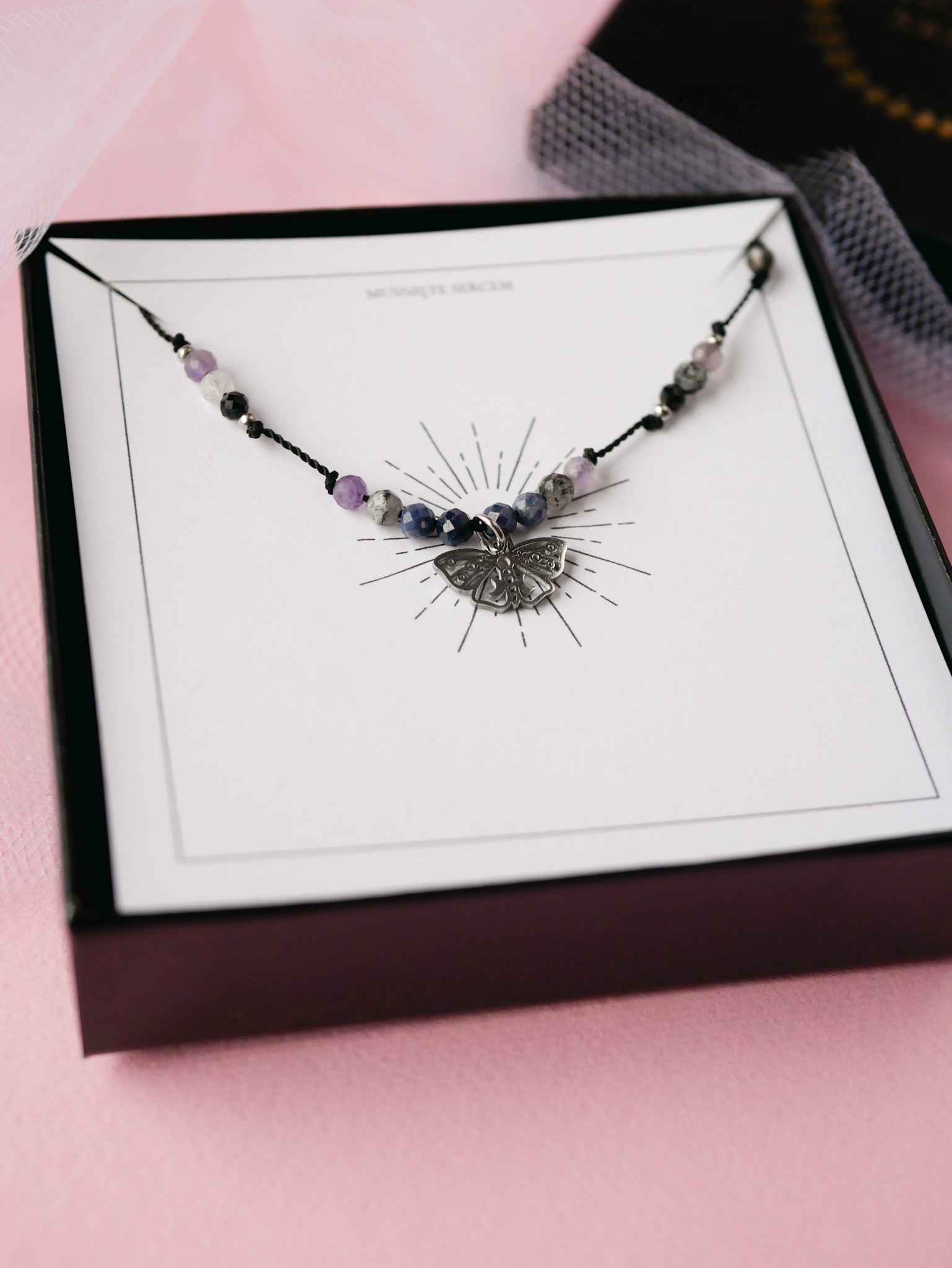 Regulowany naszyjnik z ćmą z szafirem, ametystem, czarnym turmalinem i kamieniami księżycowymi.