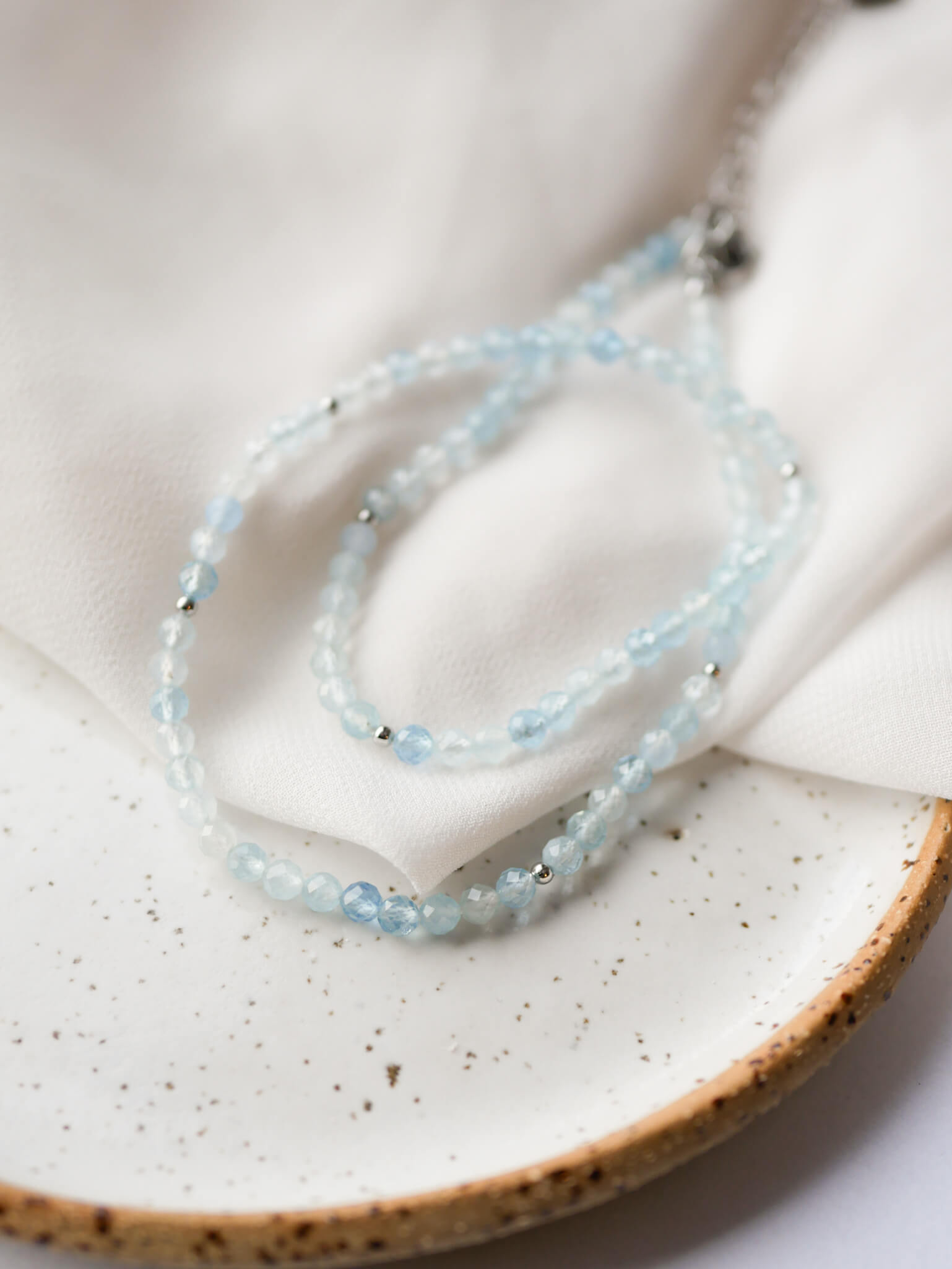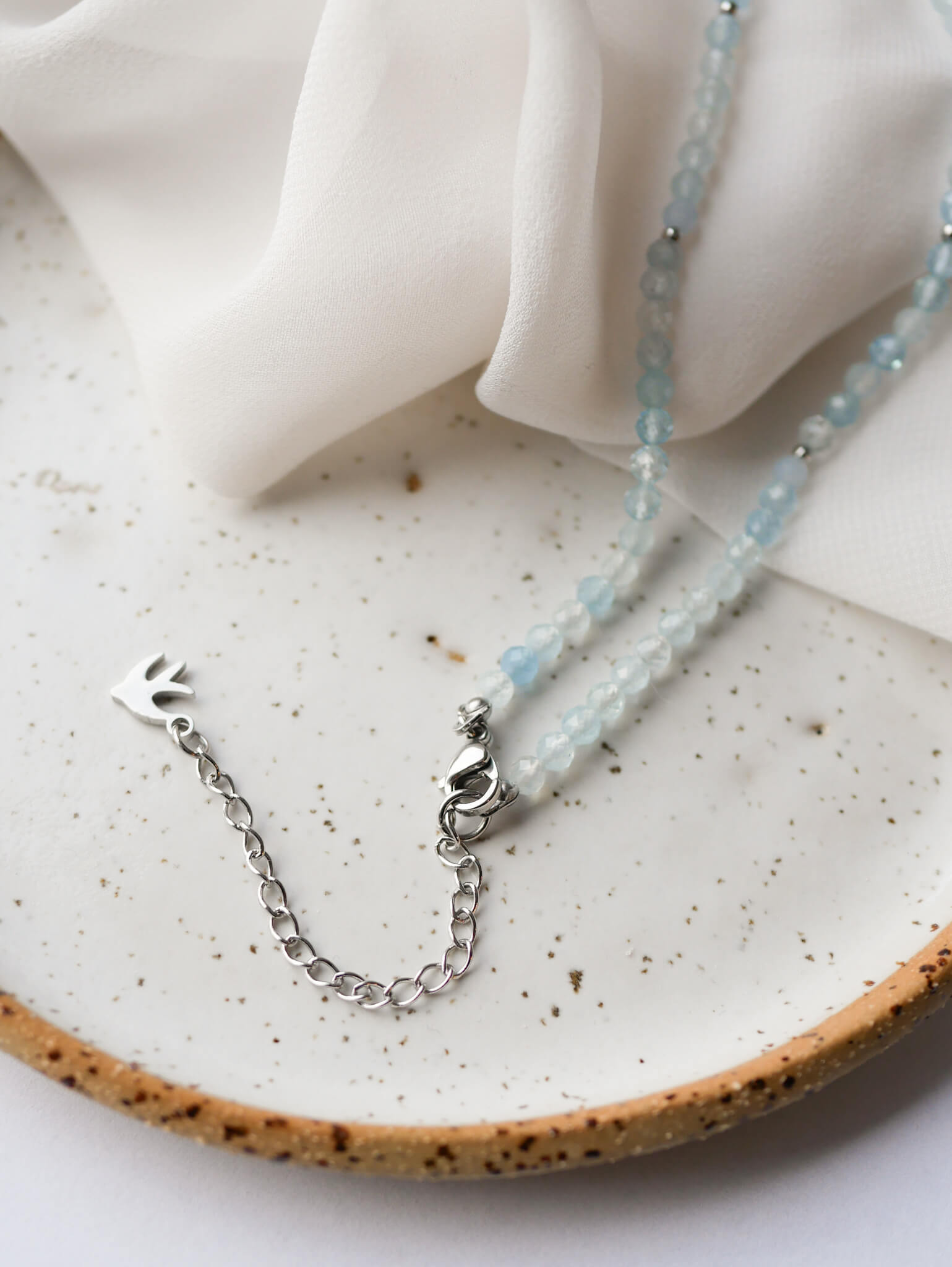 Naszyjnik z kamieni naturalnych- akwamaryny, dodatki że stali chirurgicznej, w kolorze srebra z zawieszką z jaskółką (jeżeli chcesz bez zawieszki, poinformuj nas o tym w uwagach od klienta).
