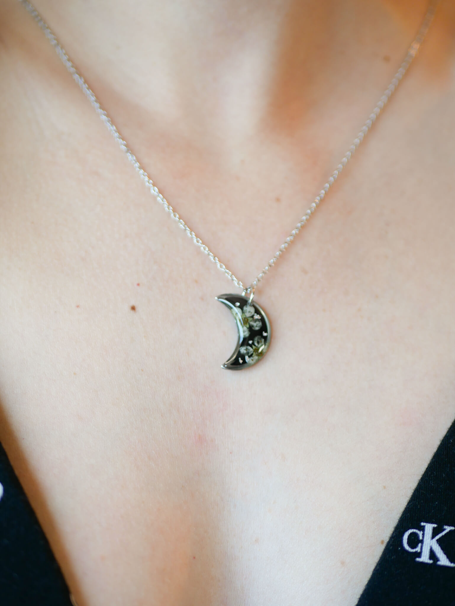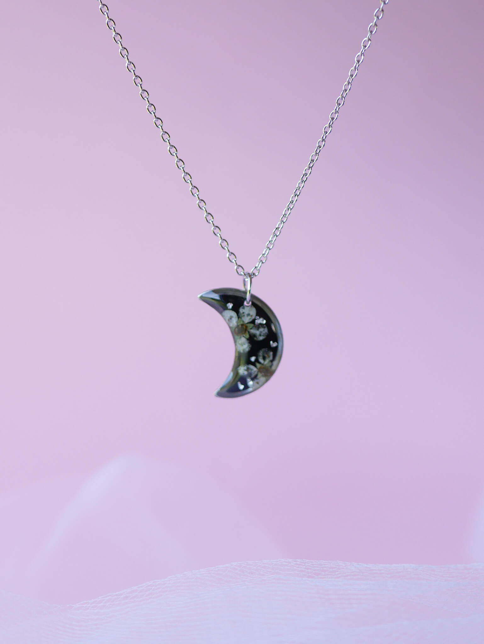 Naszyjnik księżyc z tawułą na czarnym tle z drobinkami srebra.