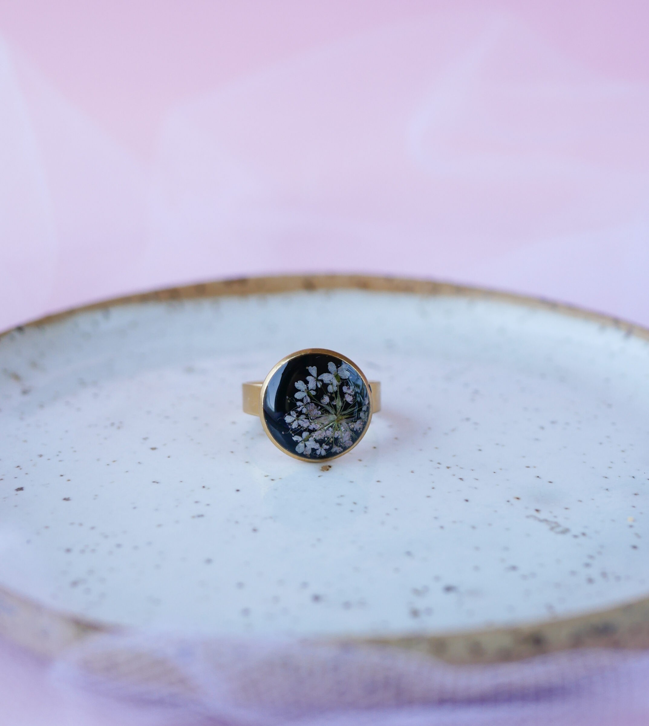 Pierścionek ze stali nierdzewnej w kolorze złota z różową dziką marchwią na czarnym tle.