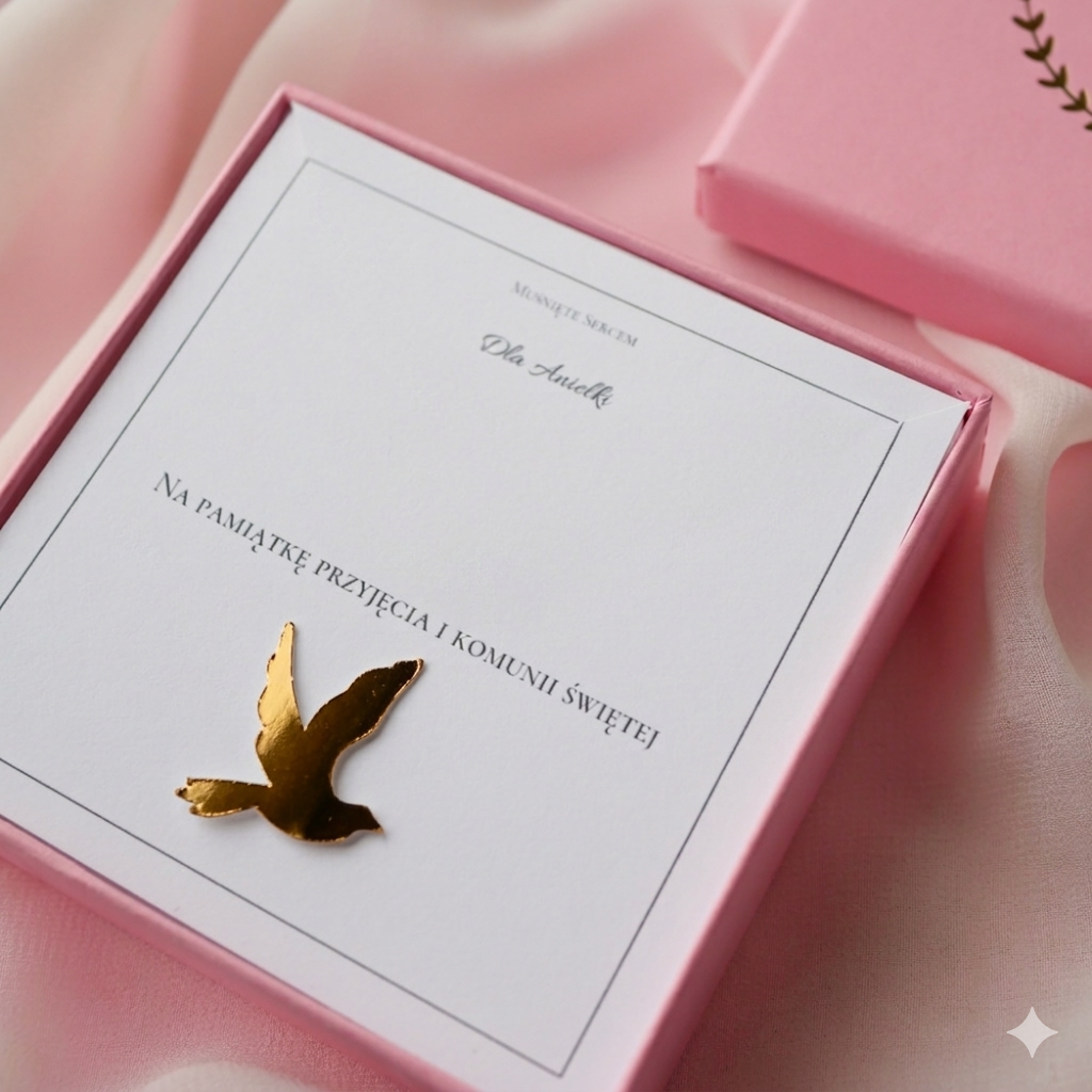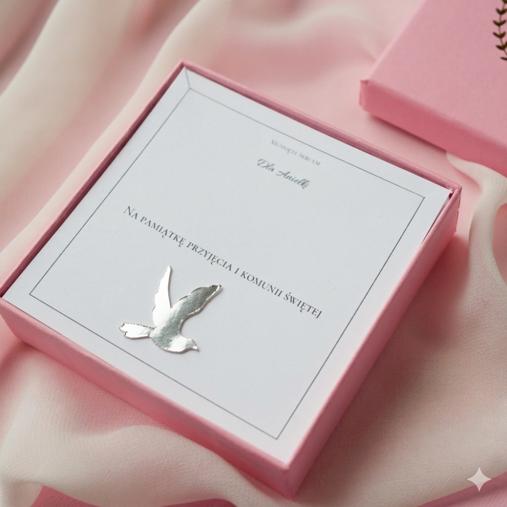 Dodatkowe zdobienie komunijne – mieniący się gołąbek do wyboru w kolorze złotym lub srebrnym. Naklejony bezpośrednio na karteczkę, na której będzie biżuteria.