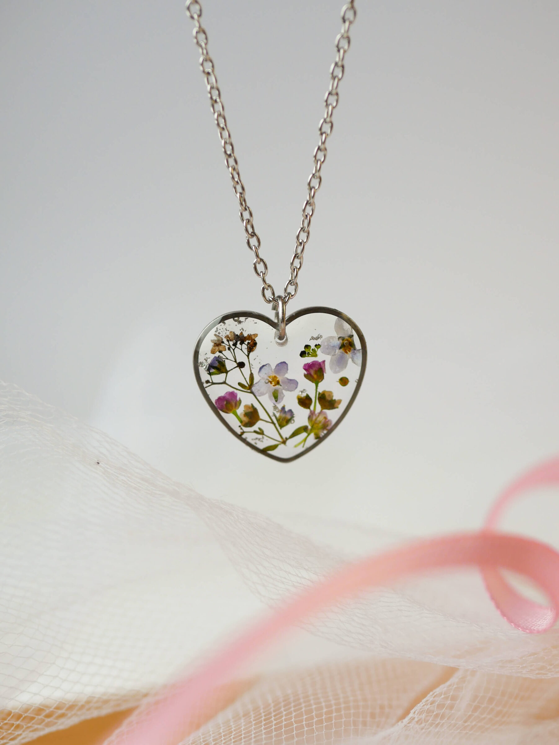 Naszyjnik serce z kwiatami górskich łąk na przeźroczystym tle z drobinkami srebra. Baza ze stali nierdzewnej w kolorze srebra.