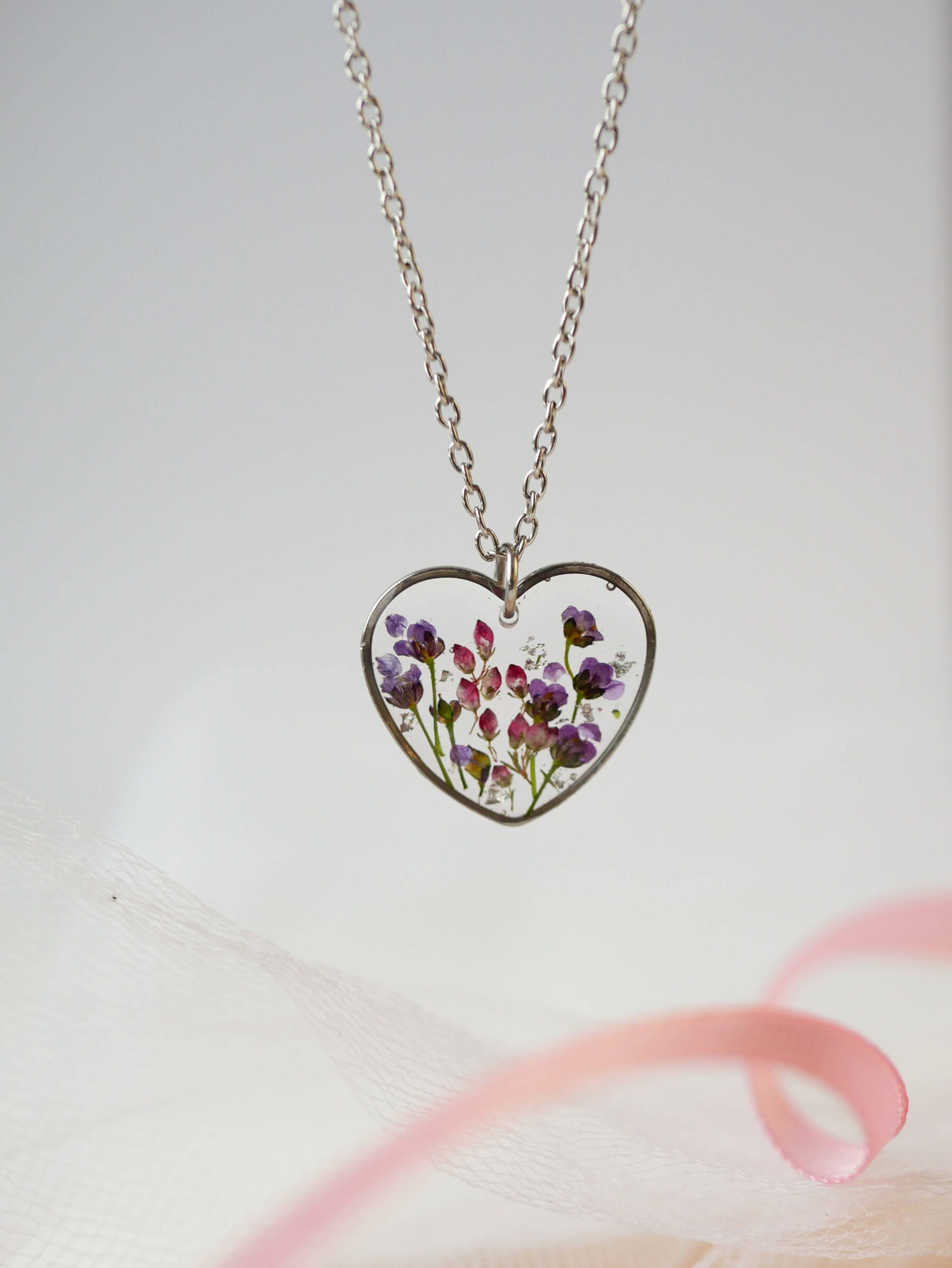 Naszyjnik serce z kwiatami górskich łąk na przeźroczystym tle z drobinkami srebra. Baza ze stali nierdzewnej w kolorze srebra.