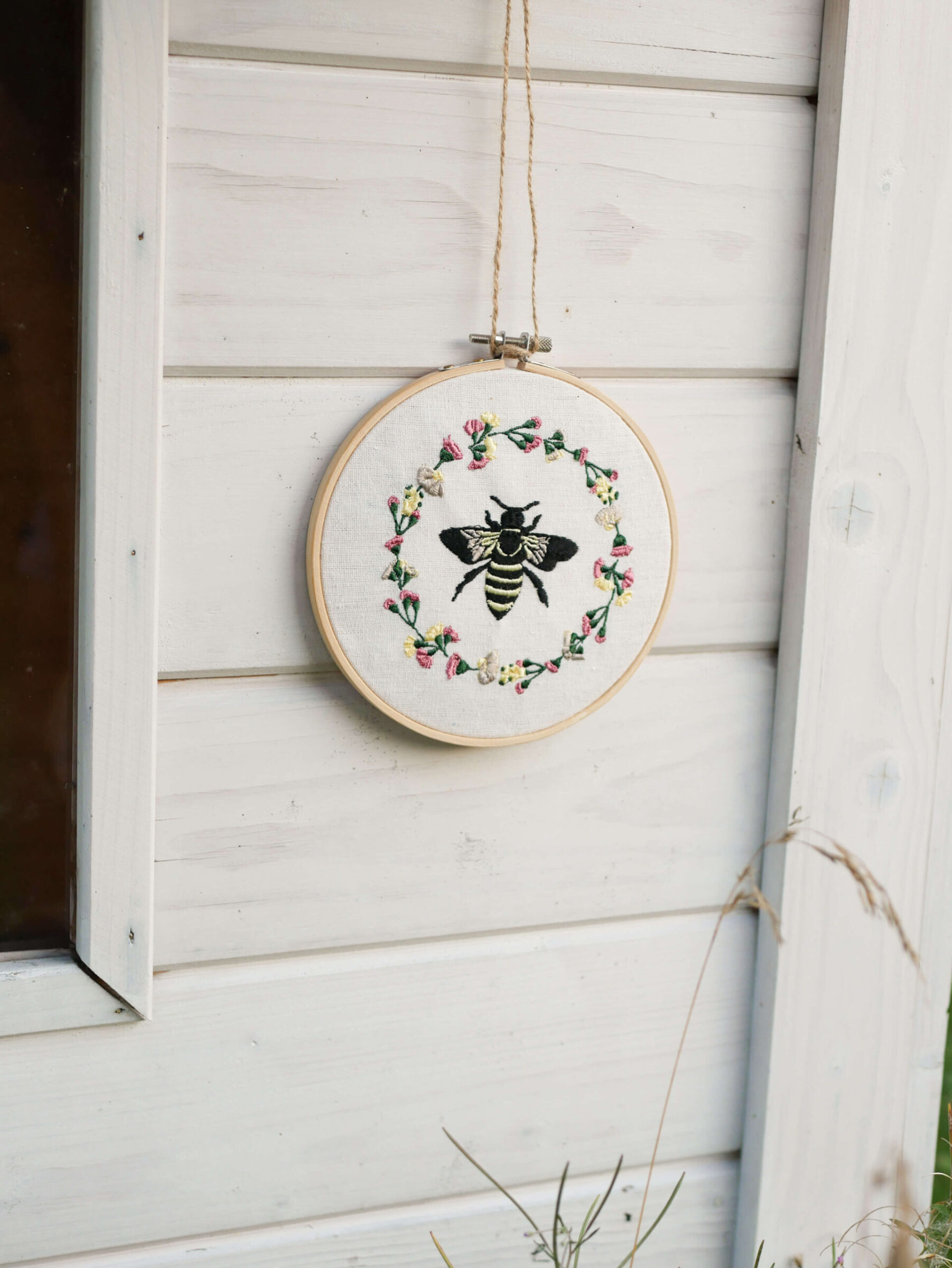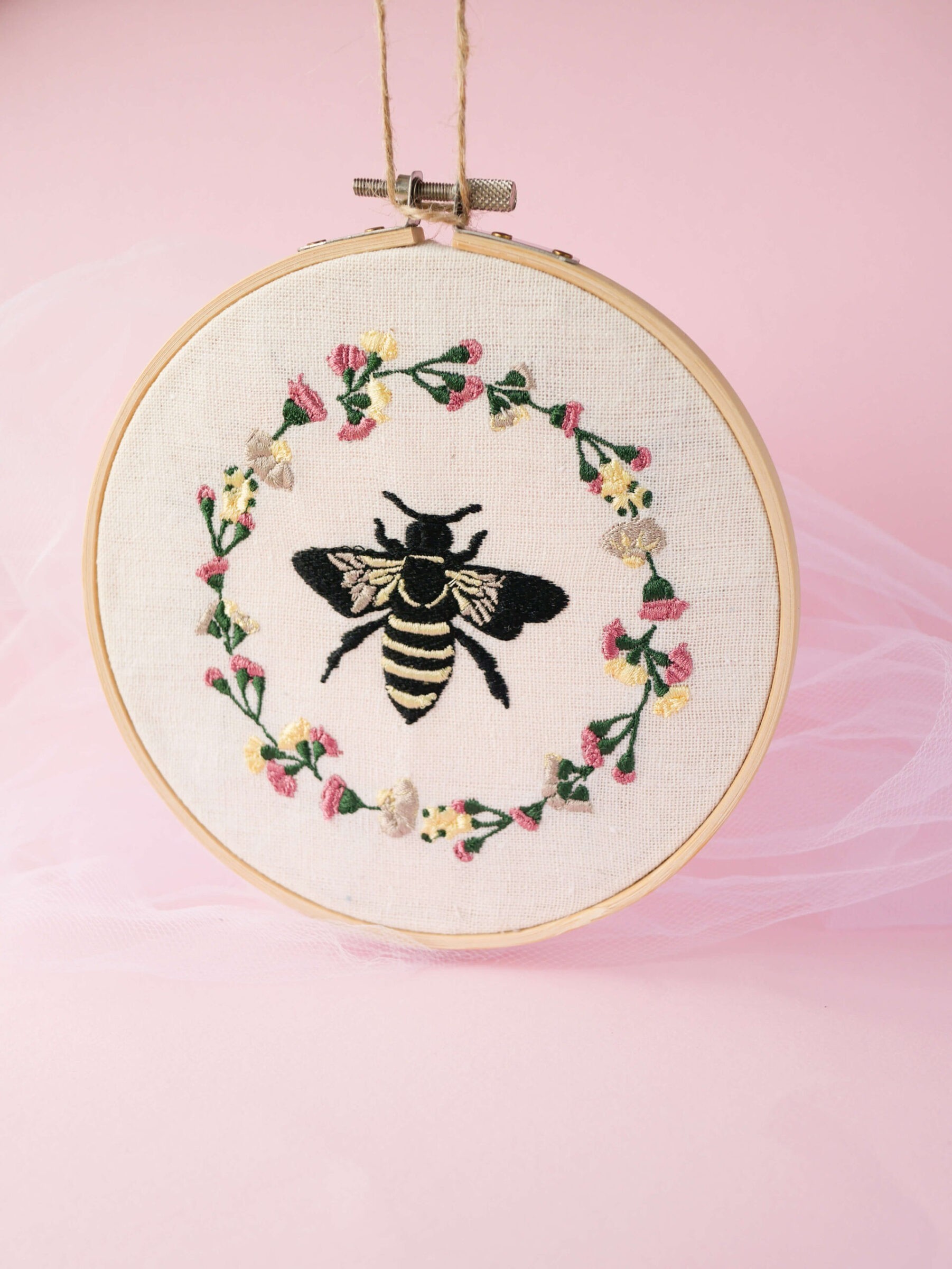 Haftowany tamborek z motywem pszczoły w wianuszku kolorowej łąki na bawełnianej tkaninie w kolorze złamanej bieli.