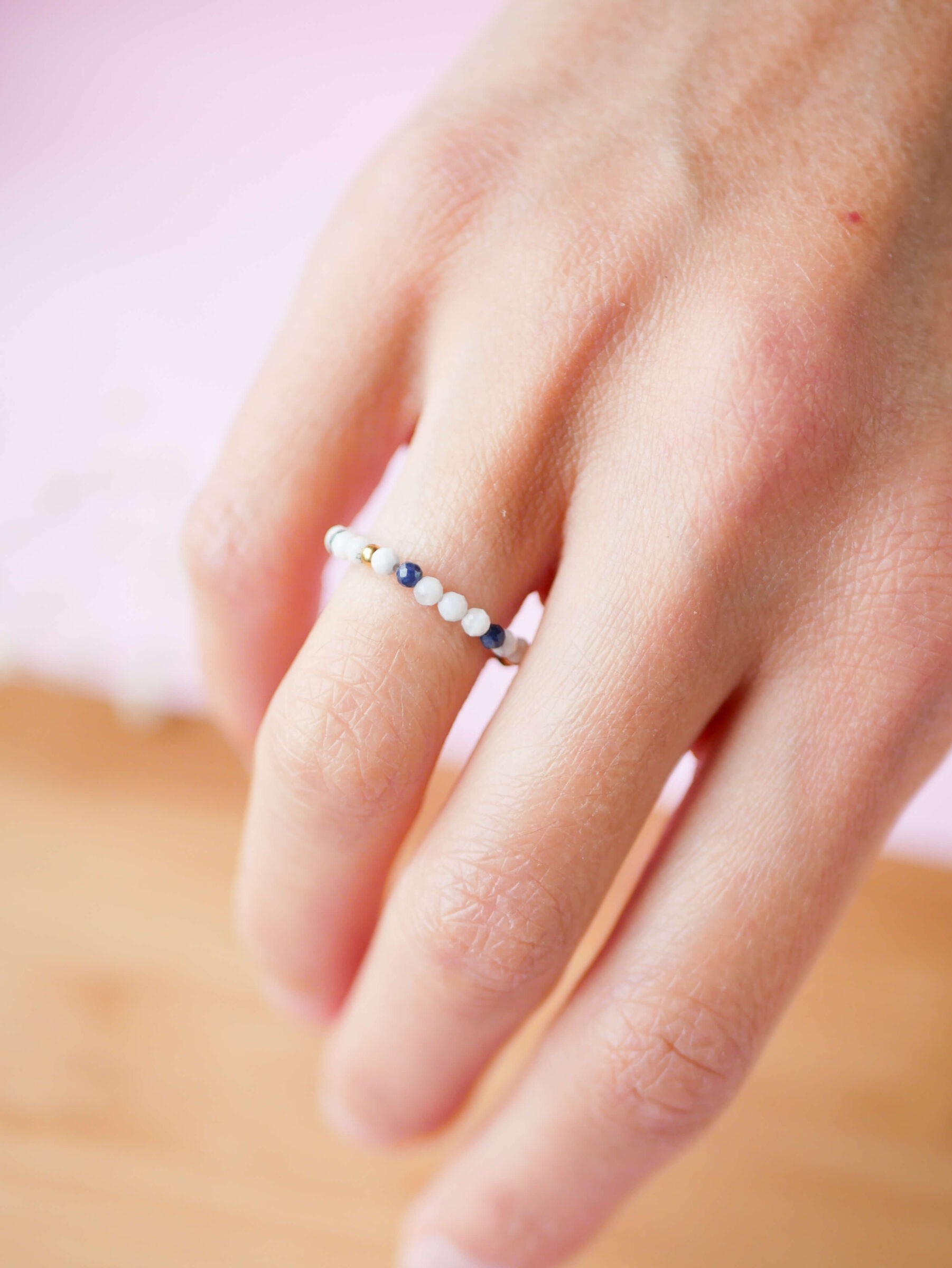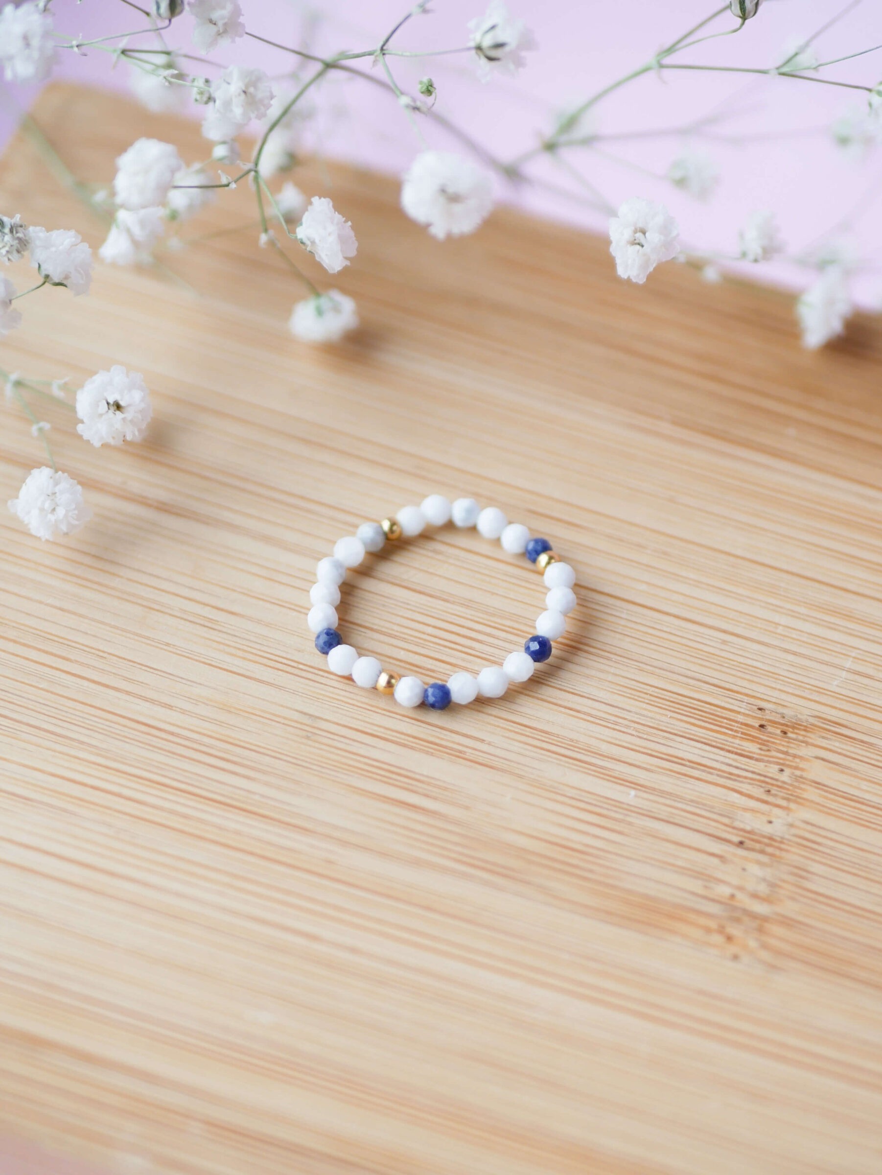 Pierścionek z kamieniem howlitu i szafiru. Na elastycznej gumce z dodatkiem koralików ze stali nierdzewnej w kolorze złota lub srebra.