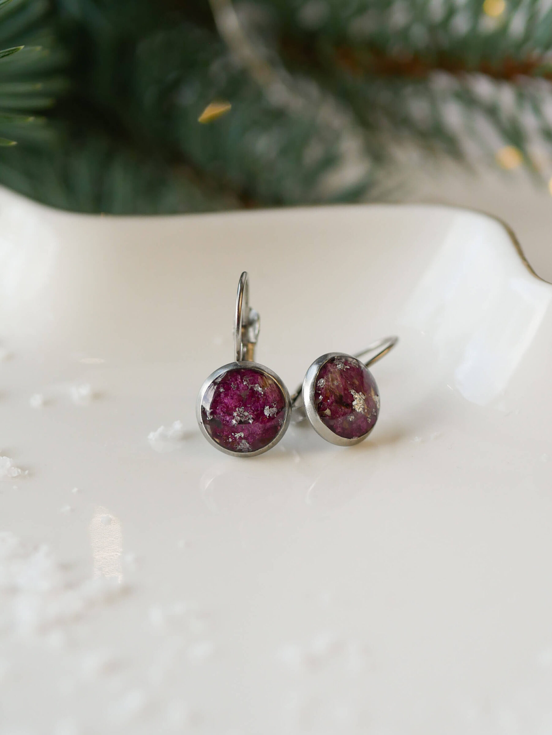 Kolczyki wiszące z zapięciem angielskim z kruszoną piwonią i drobinkami srebra.
