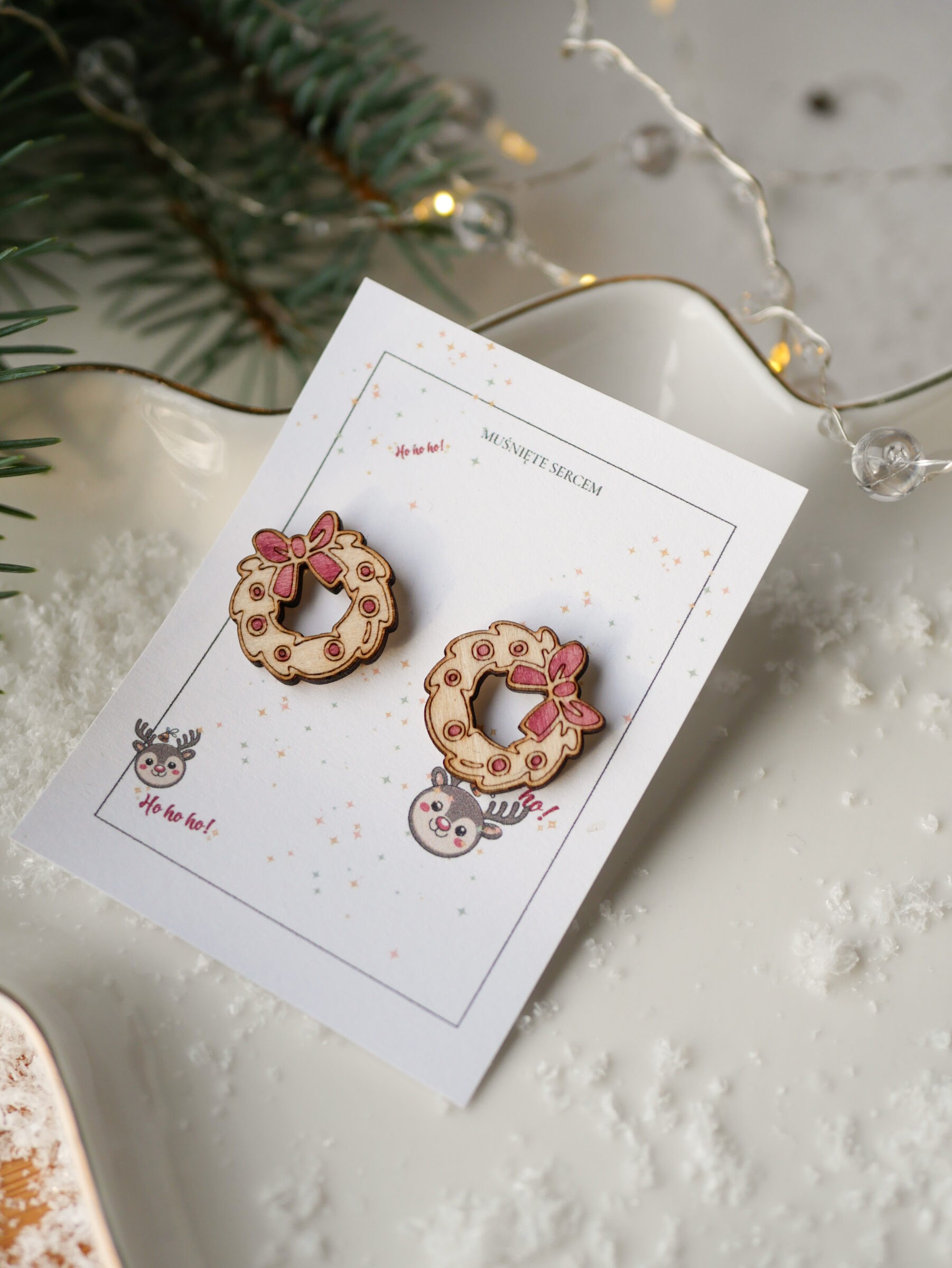 Świąteczne kolczyki, wykonane z lipowego drewna, grawerowane laserowo, malowane ręcznie, zabezpieczone lakierem. Sztyfty z antyalergicznej stali nierdzewnej.