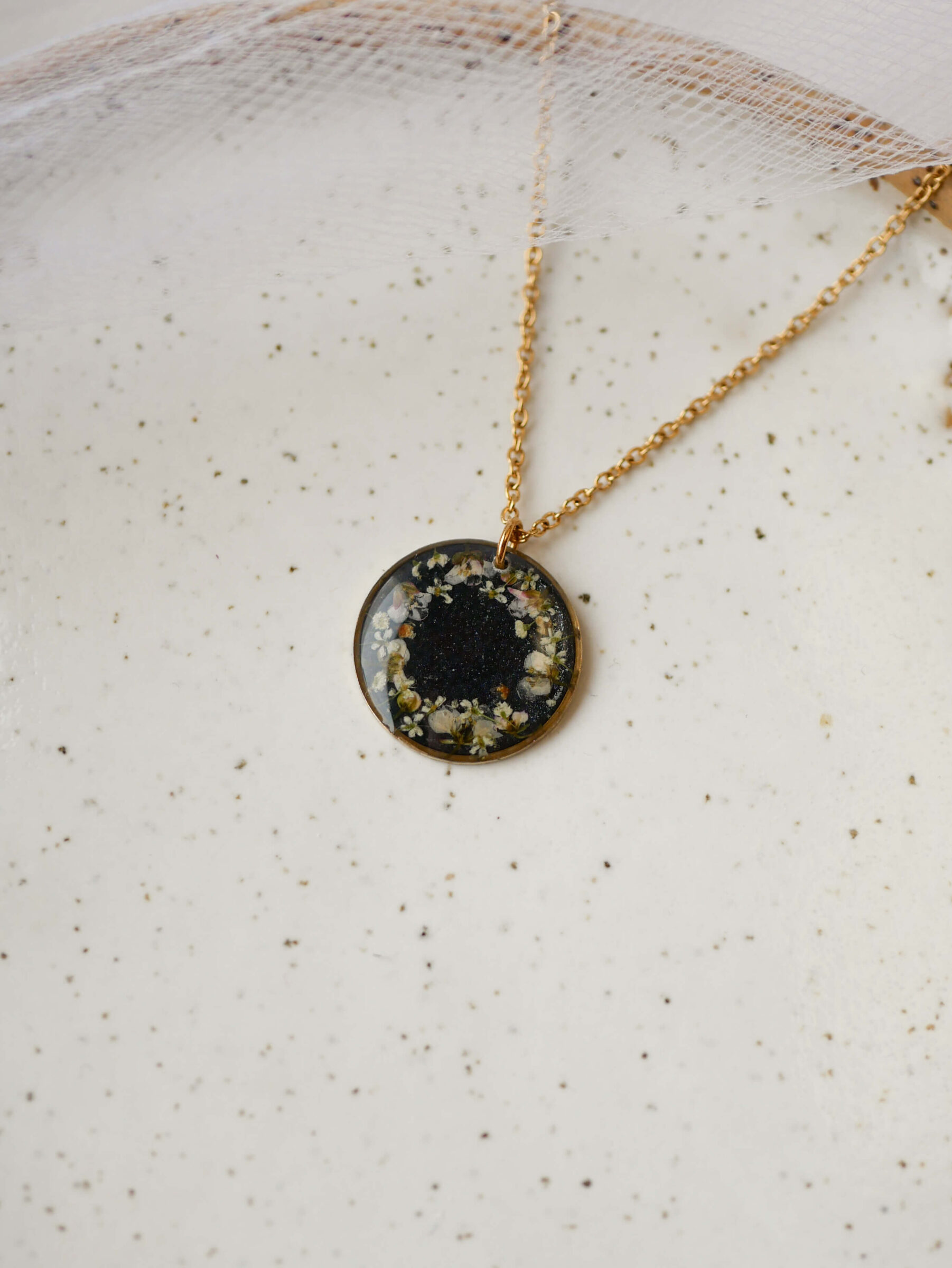Naszyjnik z wianuszkiem kwiatów smagliczki, dzikiej marchwi i gipsówki na ciemnym tle z perłową poświatą. Baza ze stali nierdzewnej w kolorze złota.