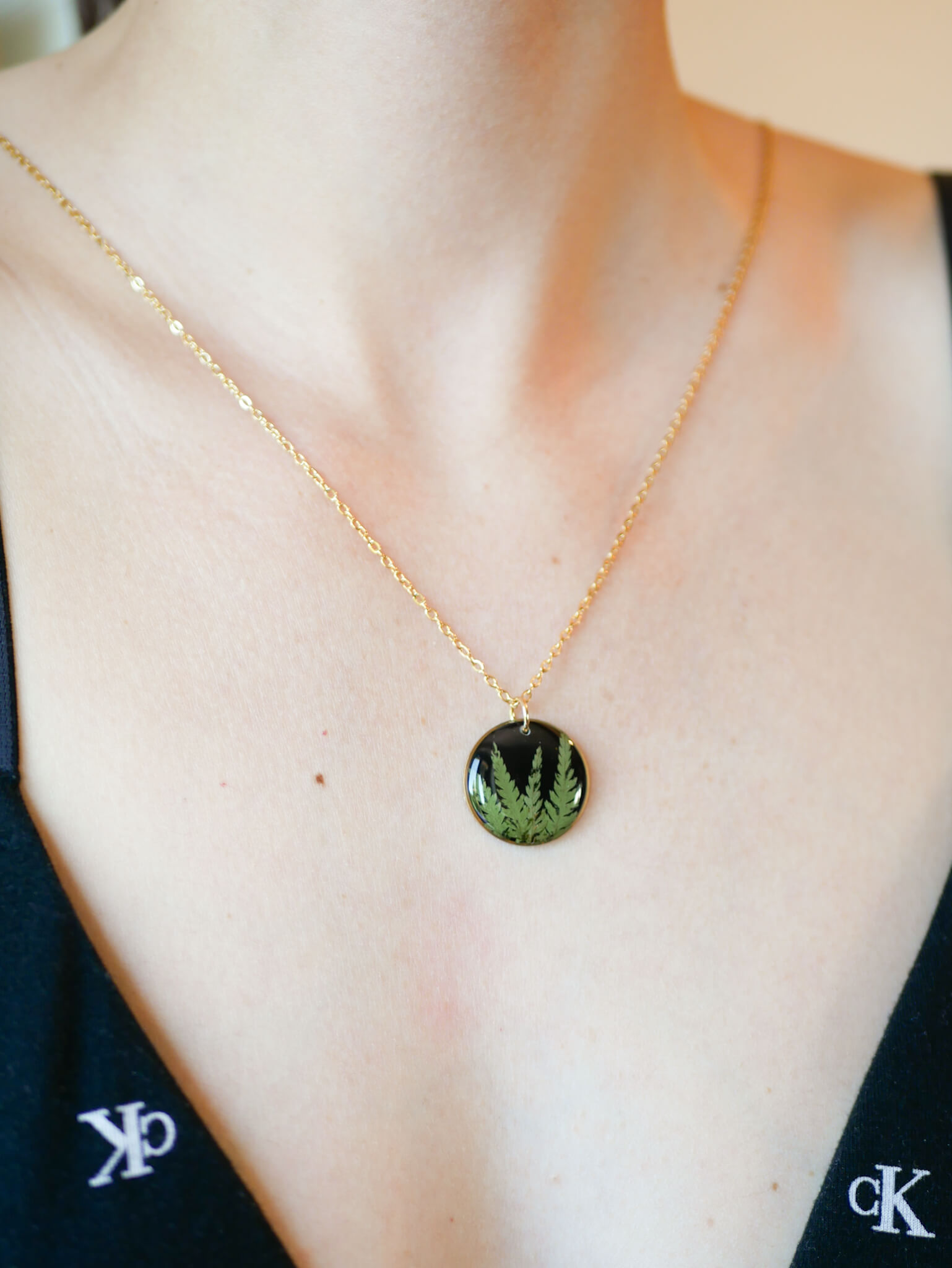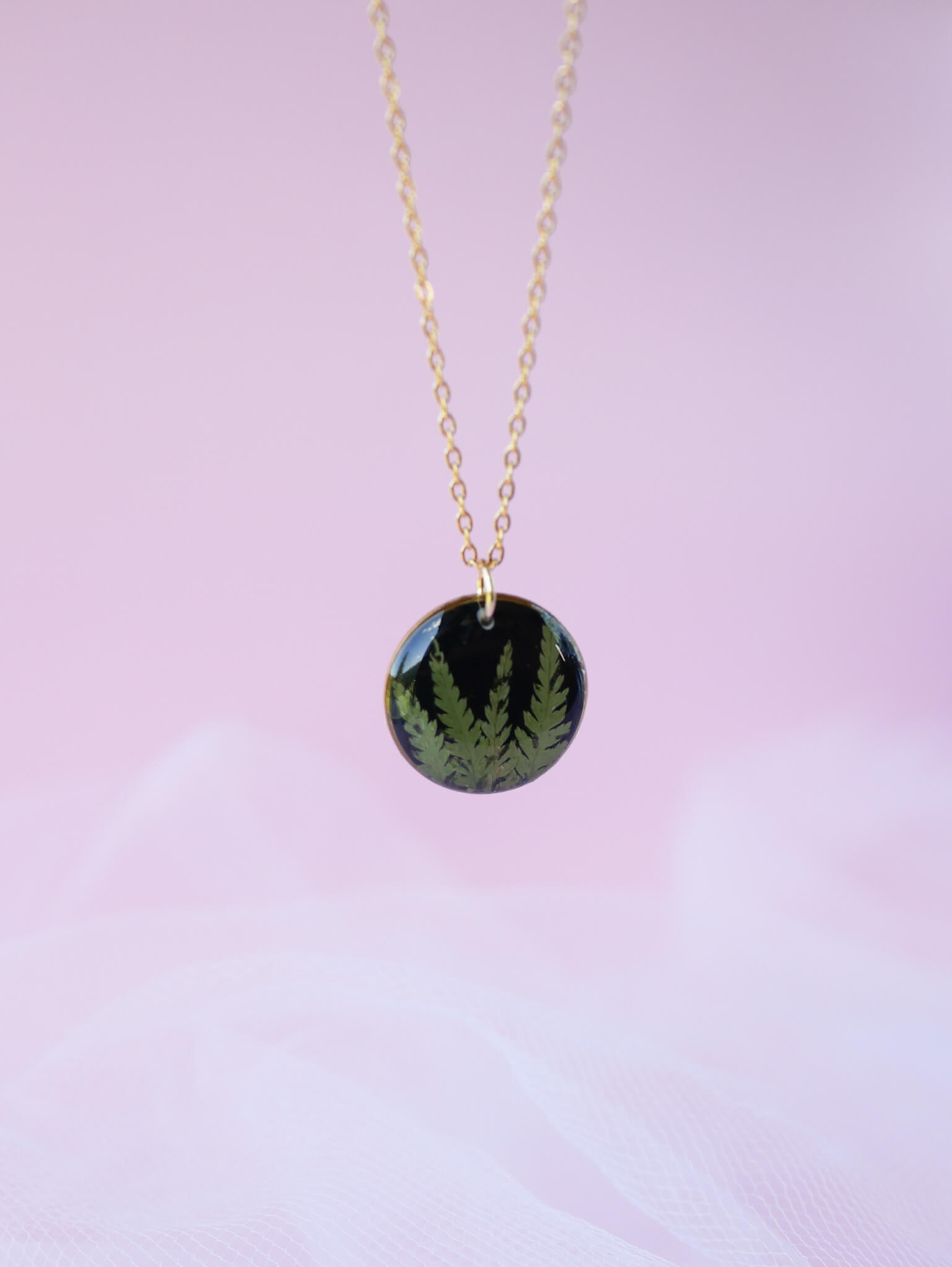 Naszyjnik z paprocią na czarnym tle. Baza ze stali nierdzewnej w kolorze złota.