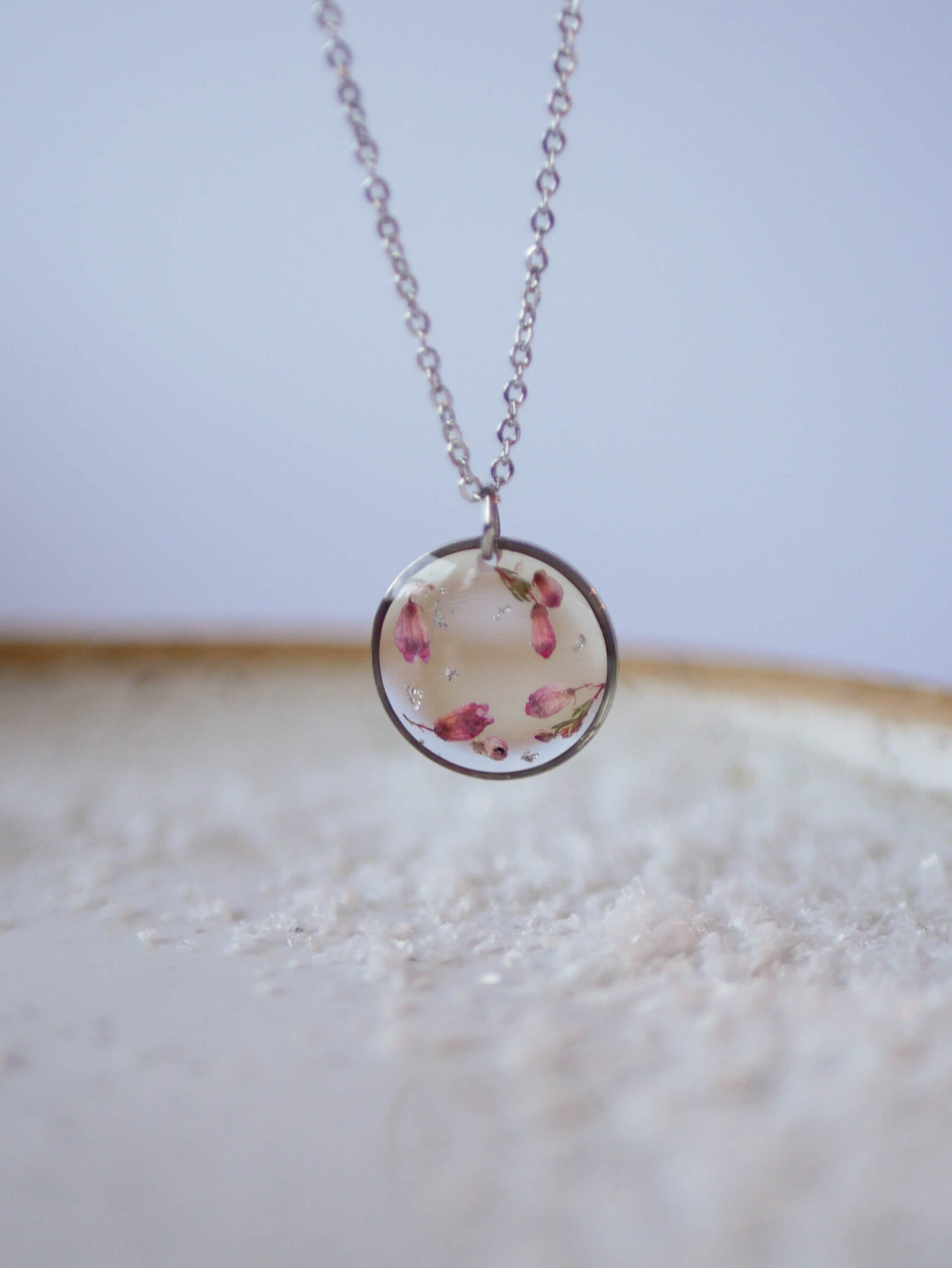 Naszyjnik z wrzoścem na przezroczystym tle. Baza ze stali nierdzewnej w kolorze srebra.