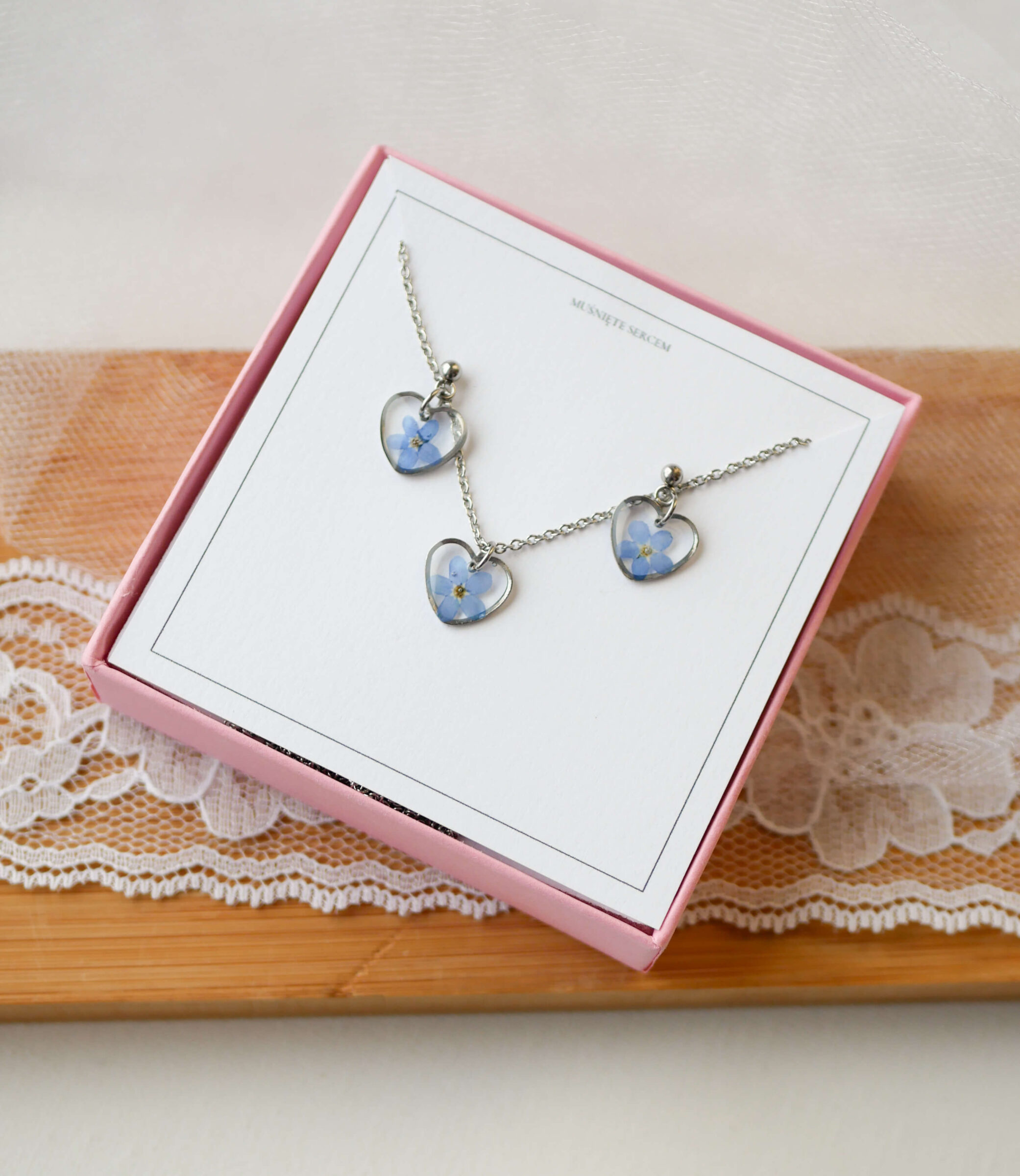 Komplet – naszyjnik + wiszące kolczyki z niezapominajkami na przezroczystym tle. Baza ze stali nierdzewnej w kolorze srebra.