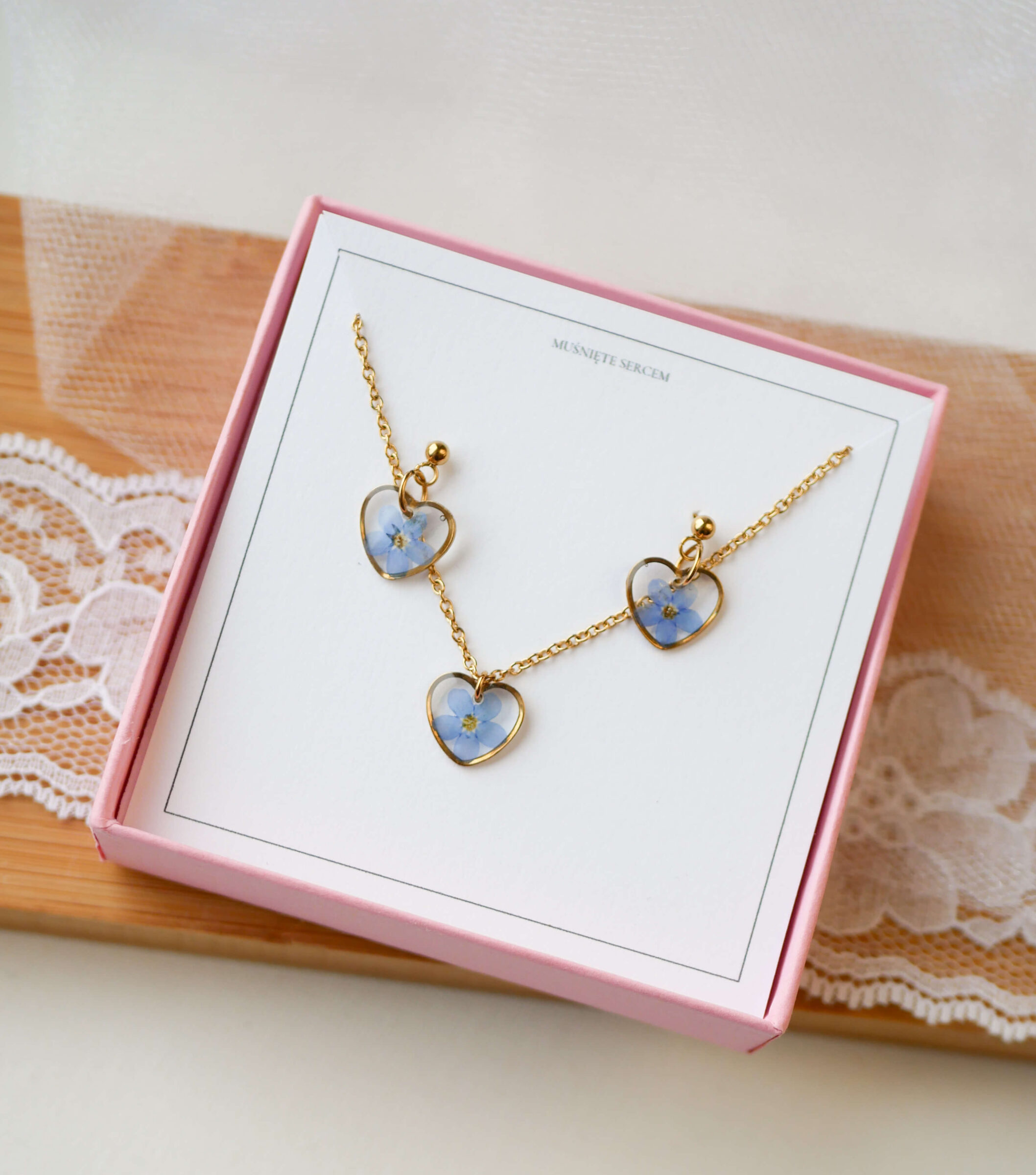 Komplet – naszyjnik + wiszące kolczyki z niezapominajkami na przezroczystym tle. Baza ze stali nierdzewnej w kolorze złota.