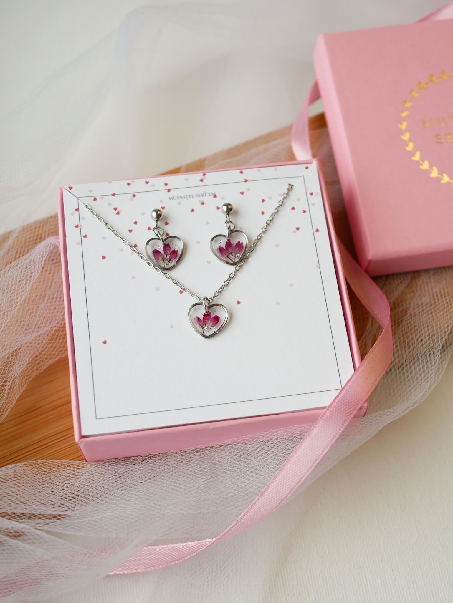 Komplet – naszyjnik + wiszące kolczyki z wrzoścem i z drobinkami srebra. Baza ze stali nierdzewnej w kolorze srebra.