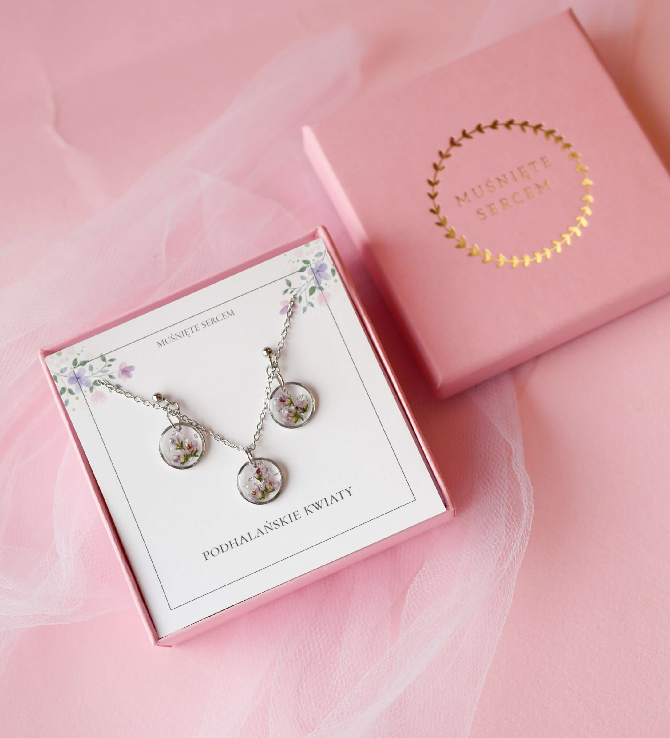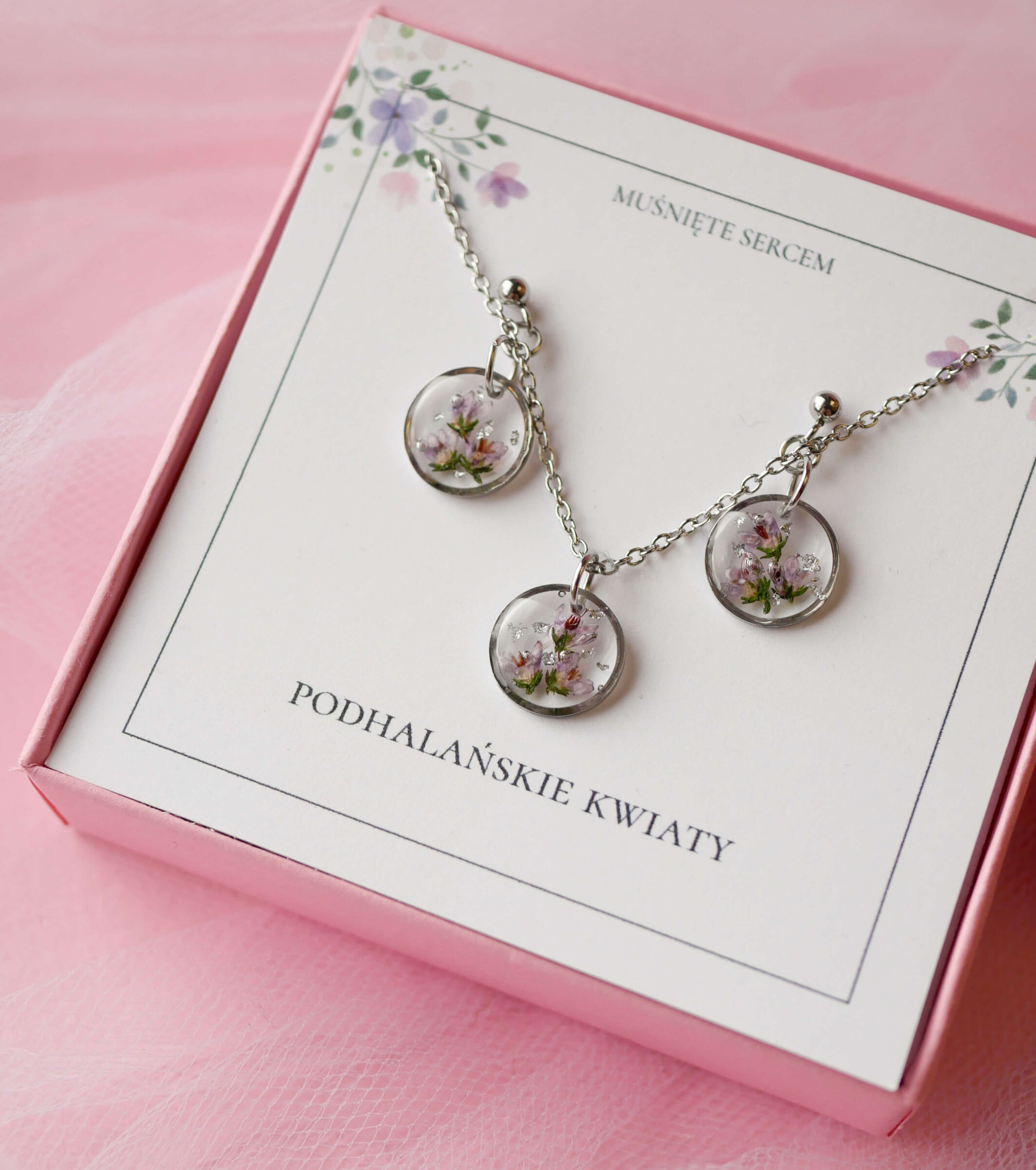 Komplet – naszyjnik + wiszące kolczyki z wrzosem z drobinkami srebra na przeźroczystym tle.  Baza ze stali nierdzewnej w kolorze srebra.