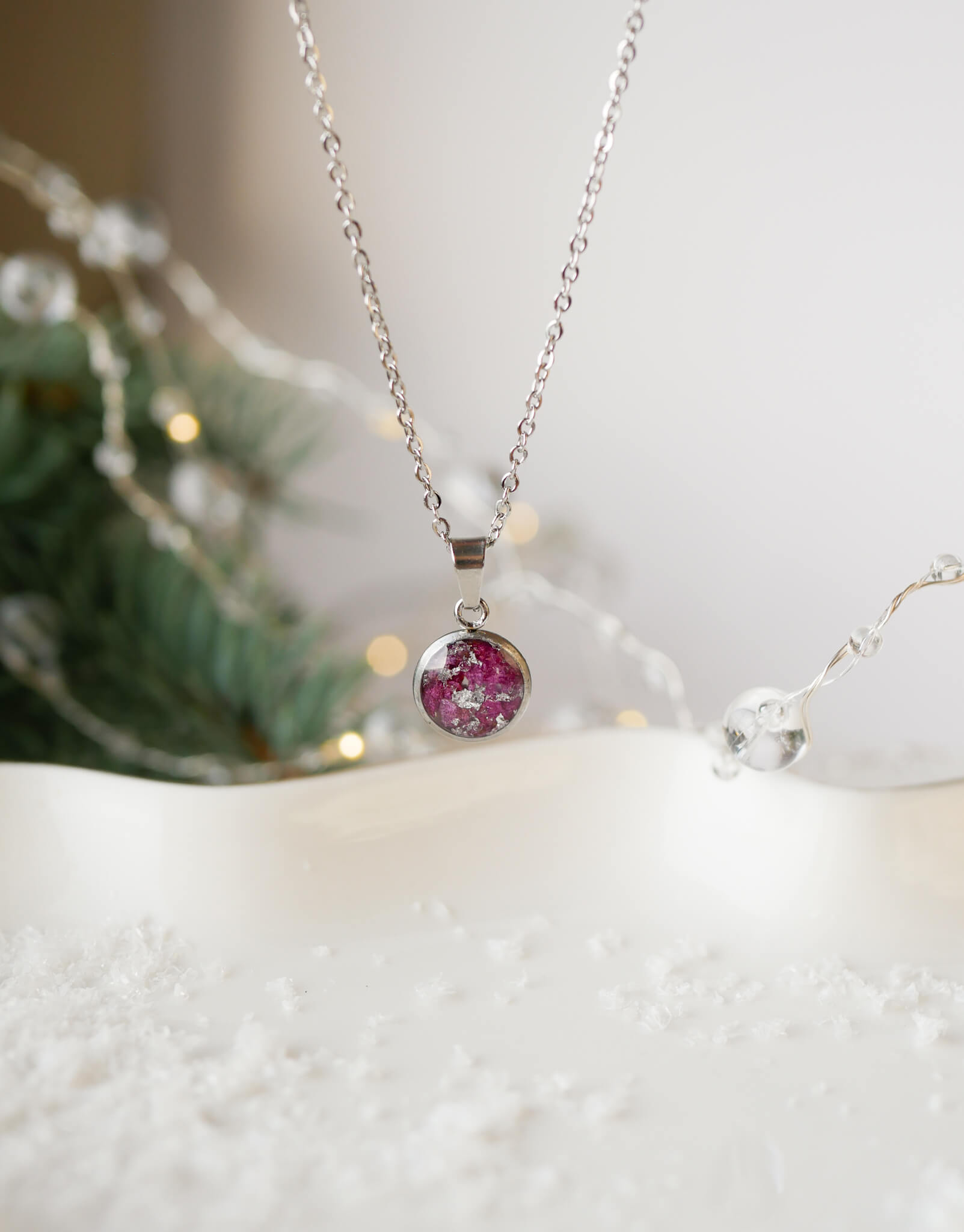 Naszyjnik w kształcie kropelki z kruszoną piwonią i drobinkami srebra.