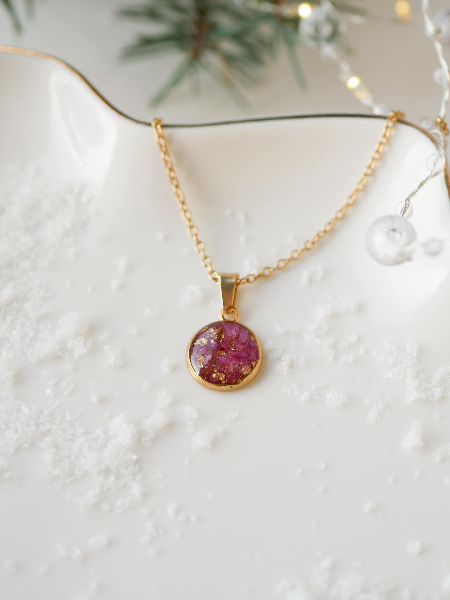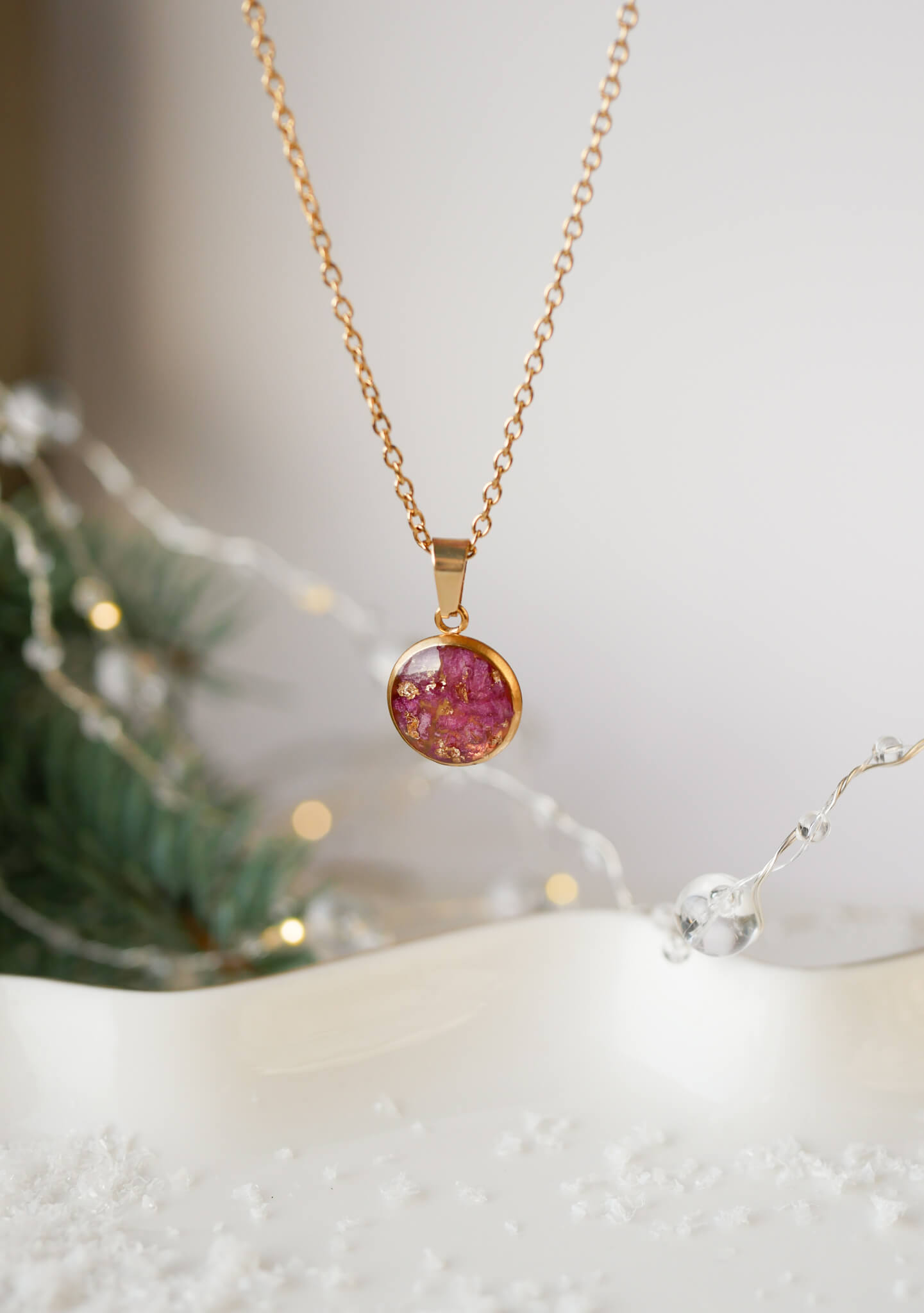 Naszyjnik w kształcie kropelki z kruszoną piwonią i drobinkami złota.