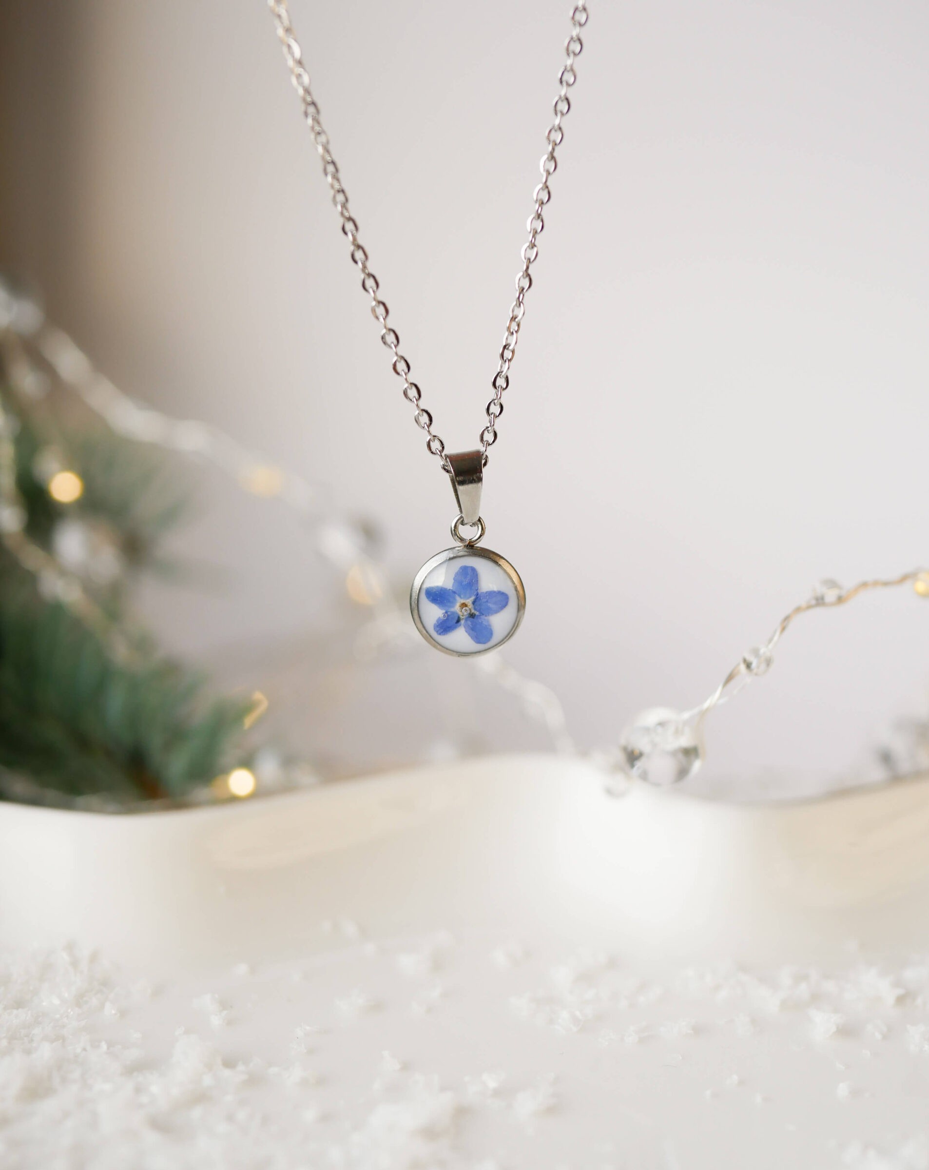 Naszyjnik w kształcie kropelki z niezapominajką na mlecznym tle.