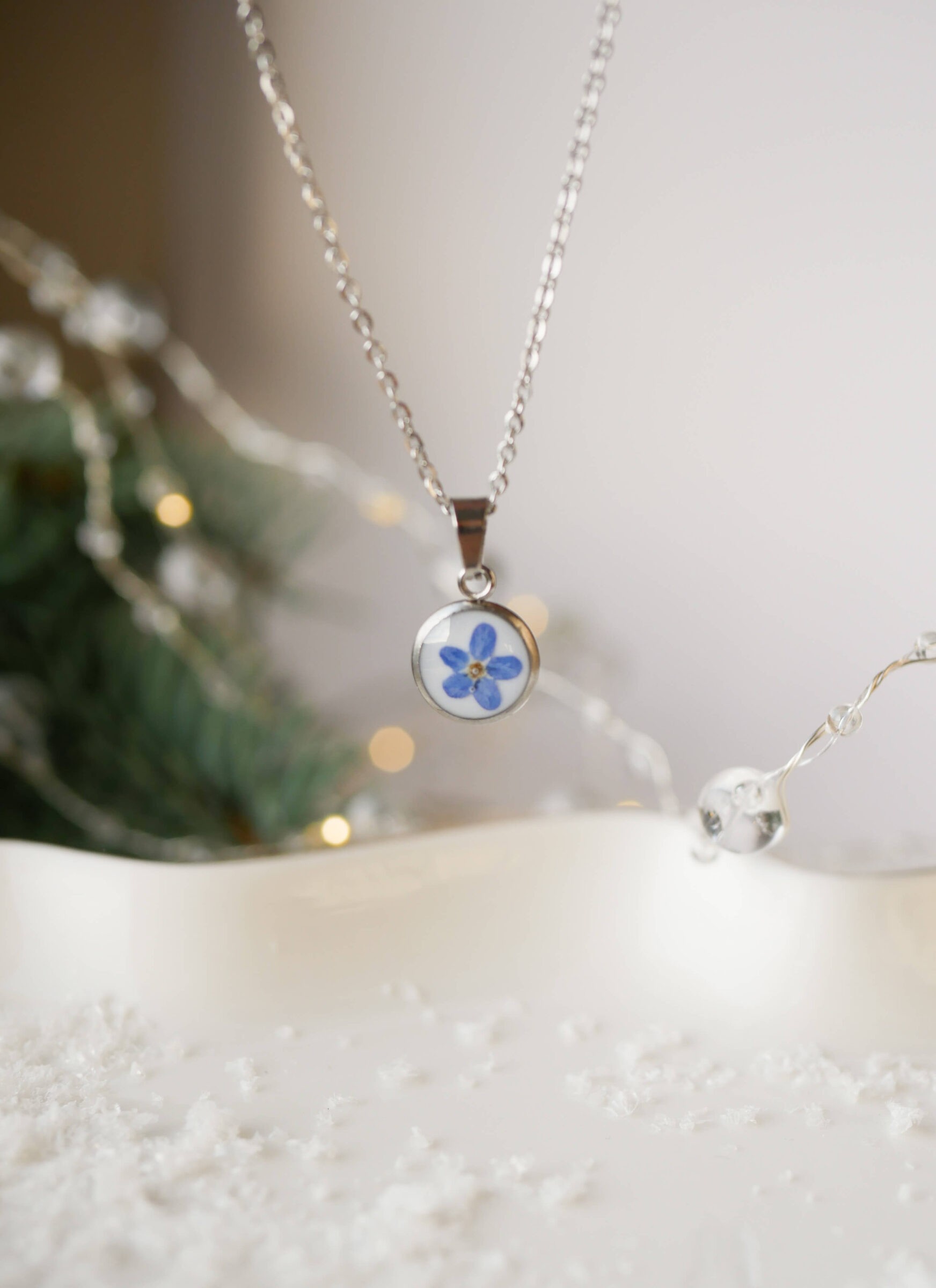 Naszyjnik w kształcie kropelki z niezapominajką na mlecznym tle.