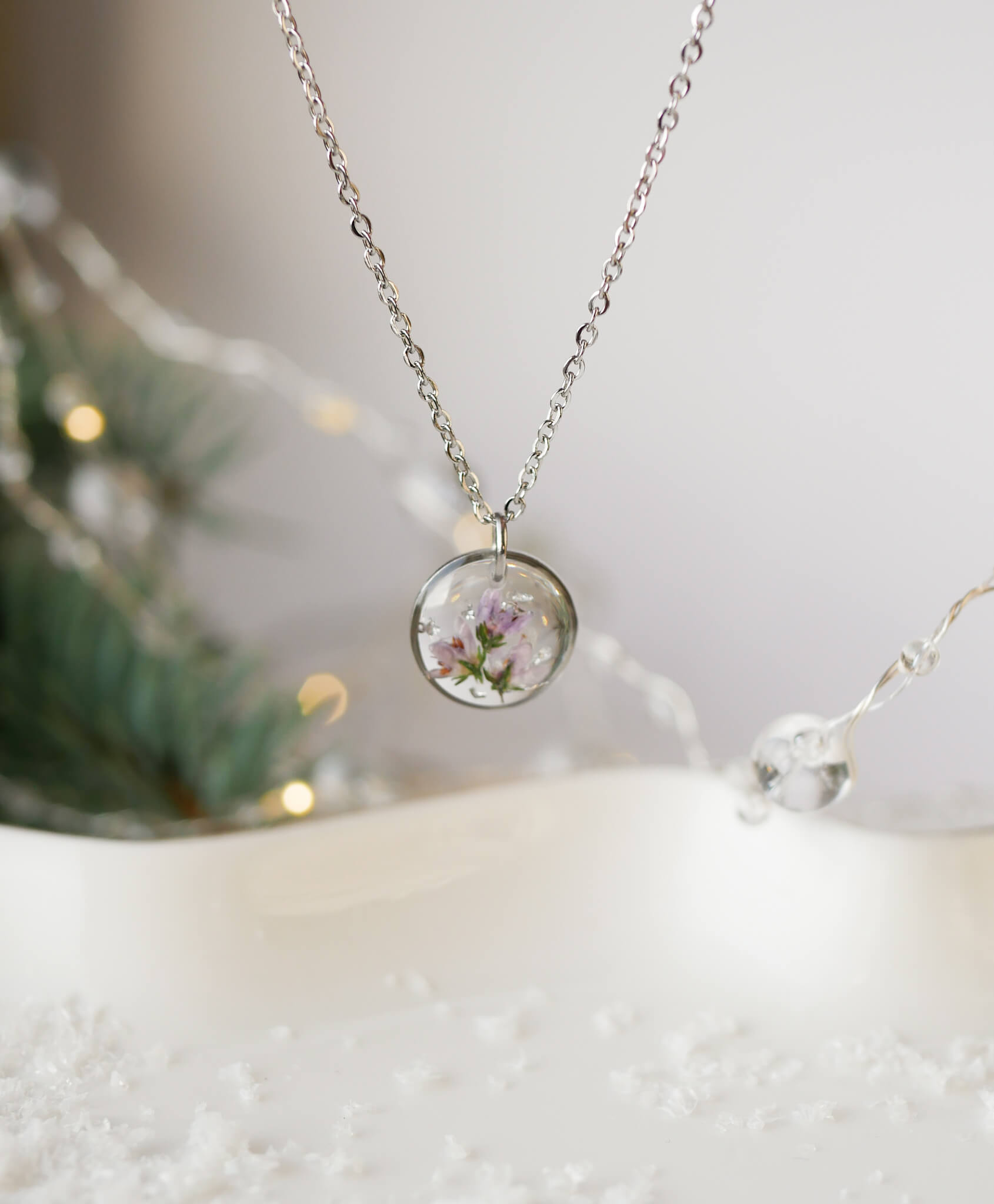 Naszyjnik w kształcie kropelki z wrzosem z drobinkami srebra na przezroczystym tle.