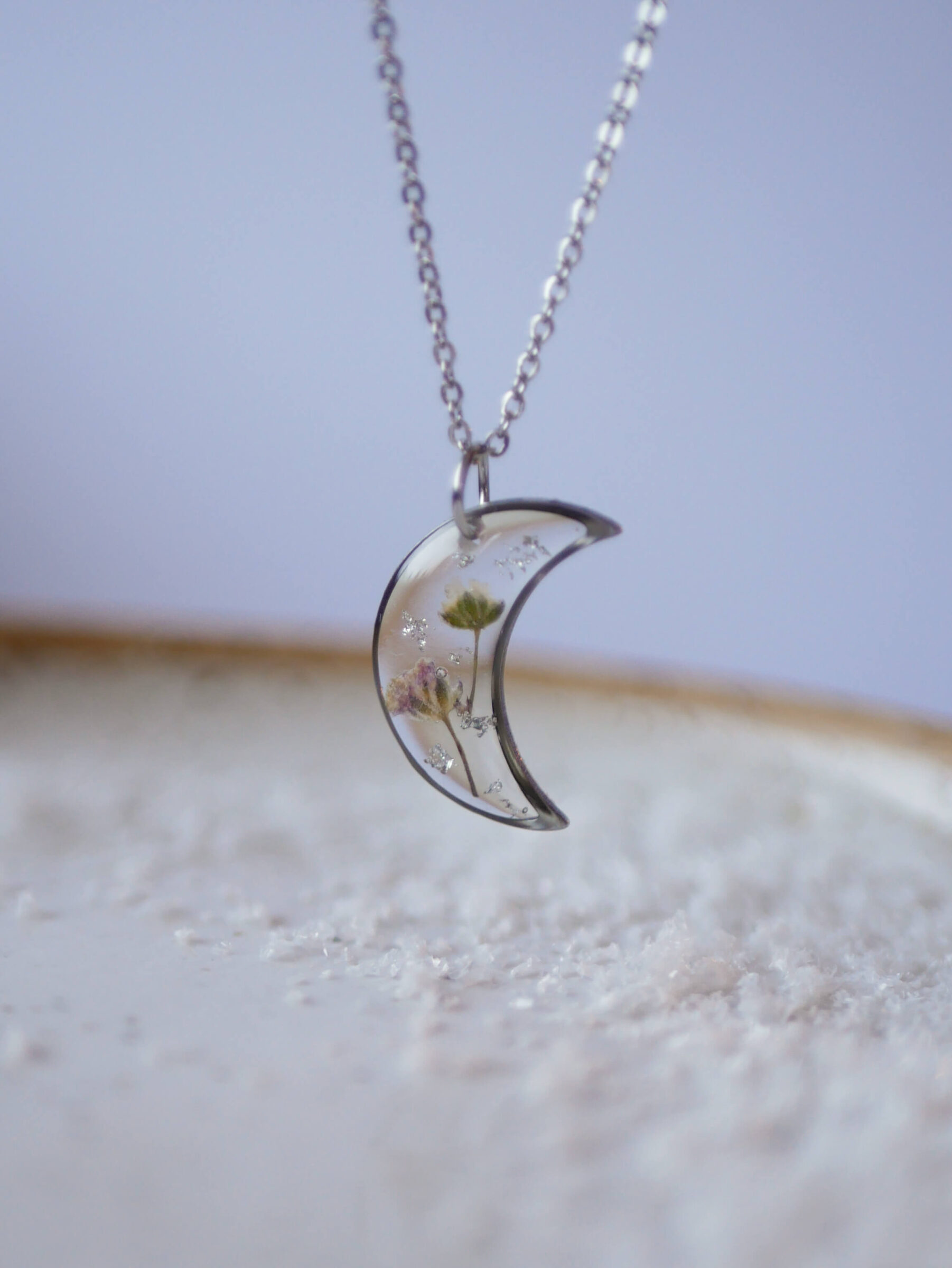 Naszyjnik w kształcie księżyca z gipsówką na przeźroczystym tle z drobinkami srebra. Baza ze stali nierdzewnej w kolorze srebra.