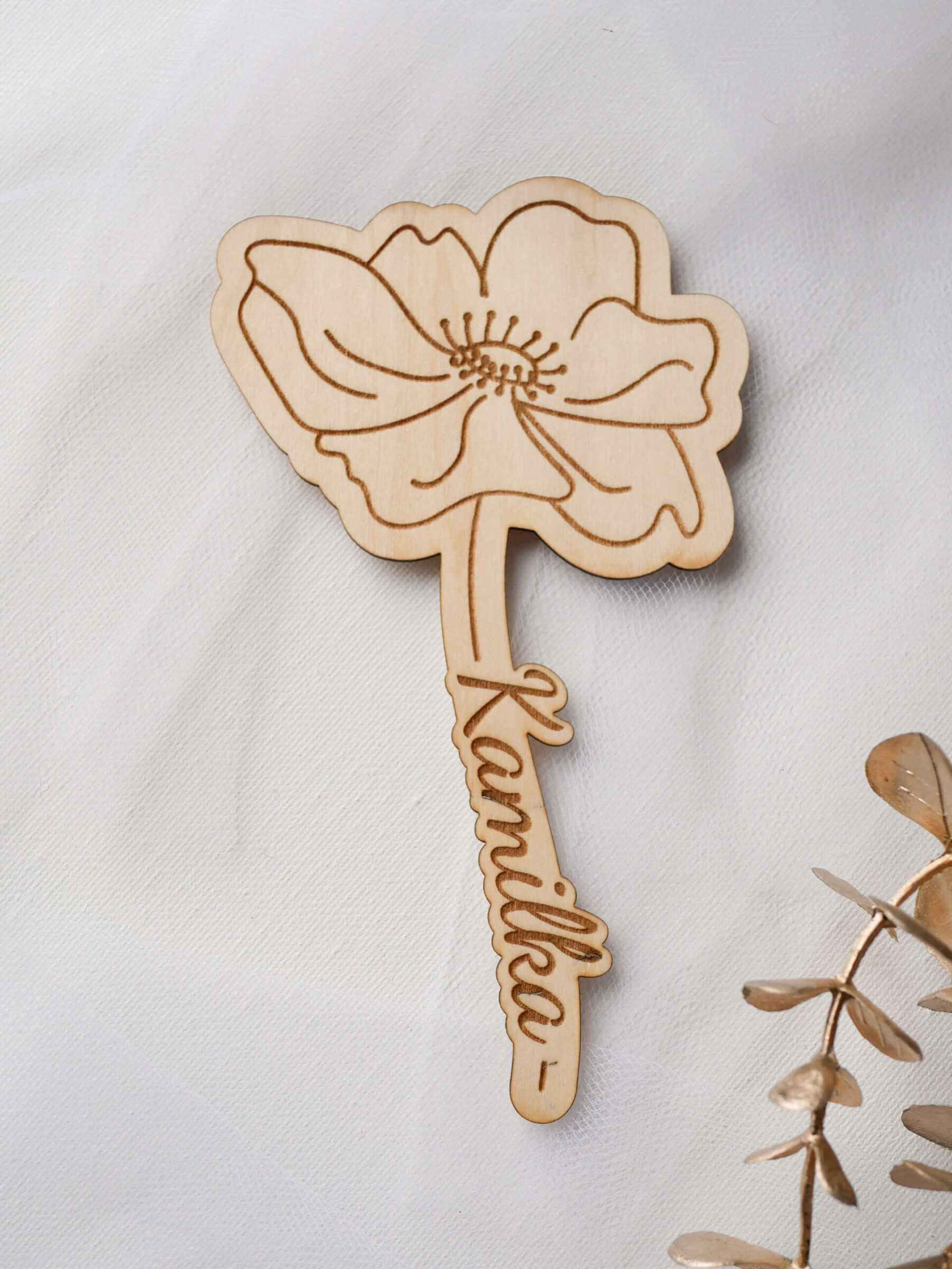Wyjątkowy upominek na Dzień Babci i Dziadka. Kwiat maku wygrawerowany na drewnie lipowym z imieniem Twojego dziecka.