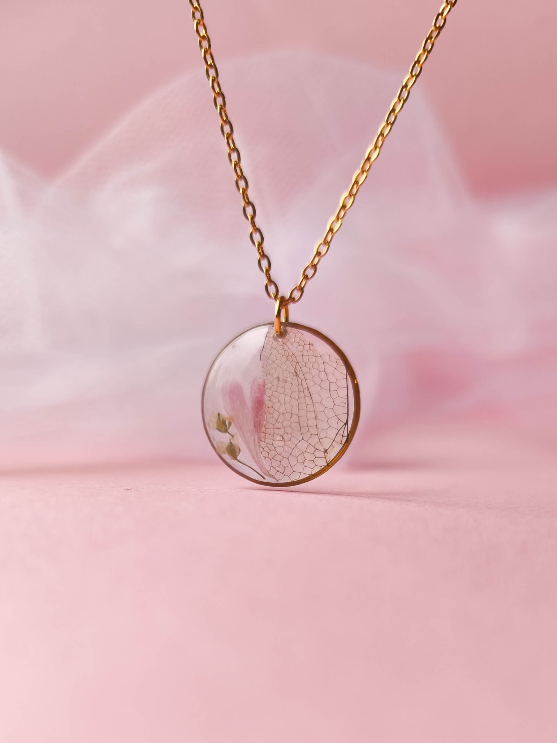 Naszyjnik z kolekcji „Leśne Wróżki” kółeczko ze skrzydełkiem ważki i płatkiem chabru na przeźroczystym tle z mnóstwem brokatowych drobinek. Baza ze stali nierdzewnej w kolorze złota.