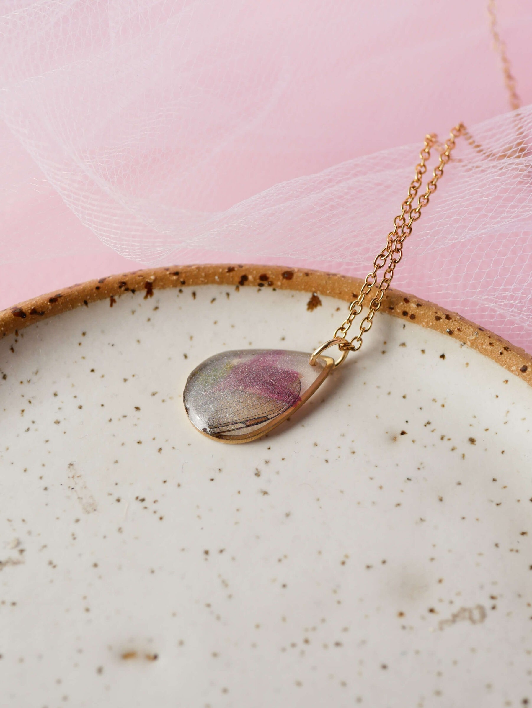Naszyjnik z kolekcji „Leśne Wróżki” łezka ze skrzydełkiem ważki i płatkiem różowego chabru na przeźroczystym tle z mnóstwem brokatowych drobinek. Baza ze stali nierdzewnej w kolorze złota.
