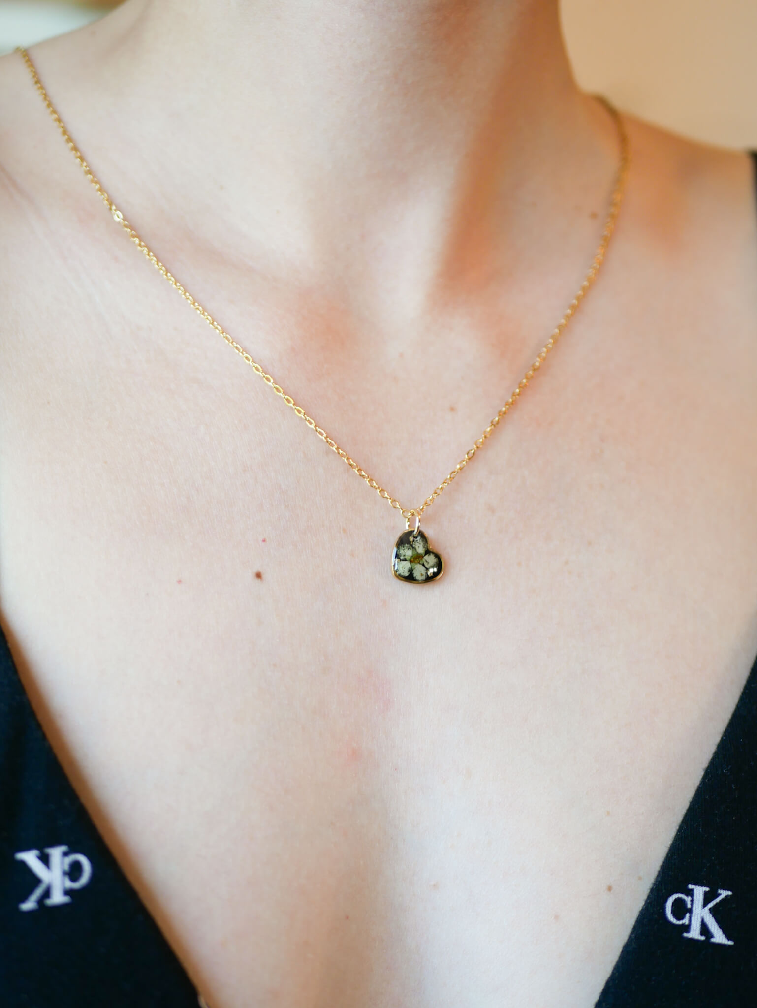 Naszyjnik z tawułą z drobinkami złota na czarnym tle. Baza ze stali nierdzewnej w kolorze złota.