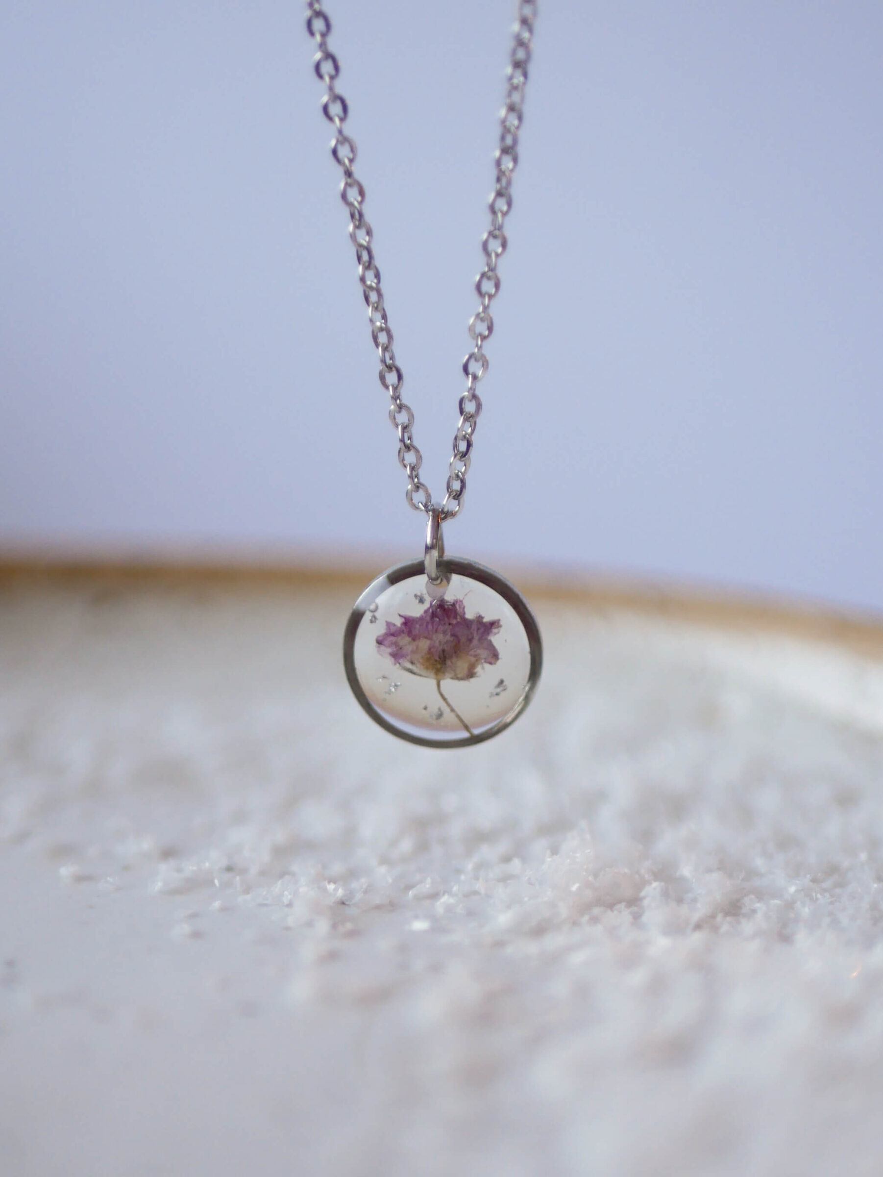 Naszyjnik w kształcie kółeczka z gipsówką na przezroczystym tle.