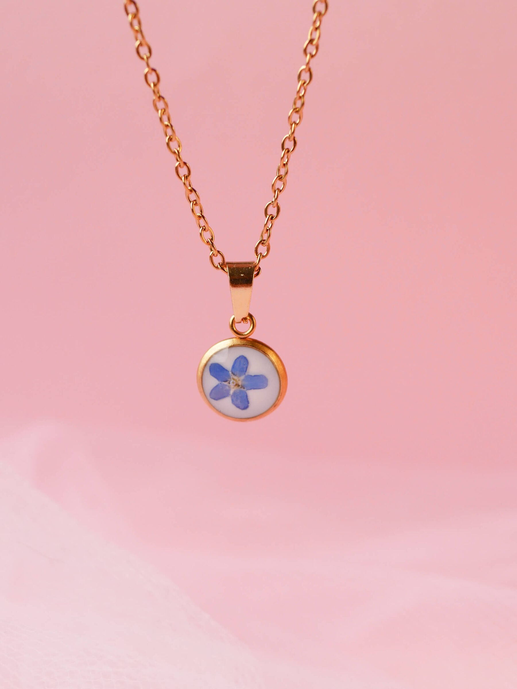 Naszyjnik w kształcie kropelki z niezapominajką na mlecznym tle.