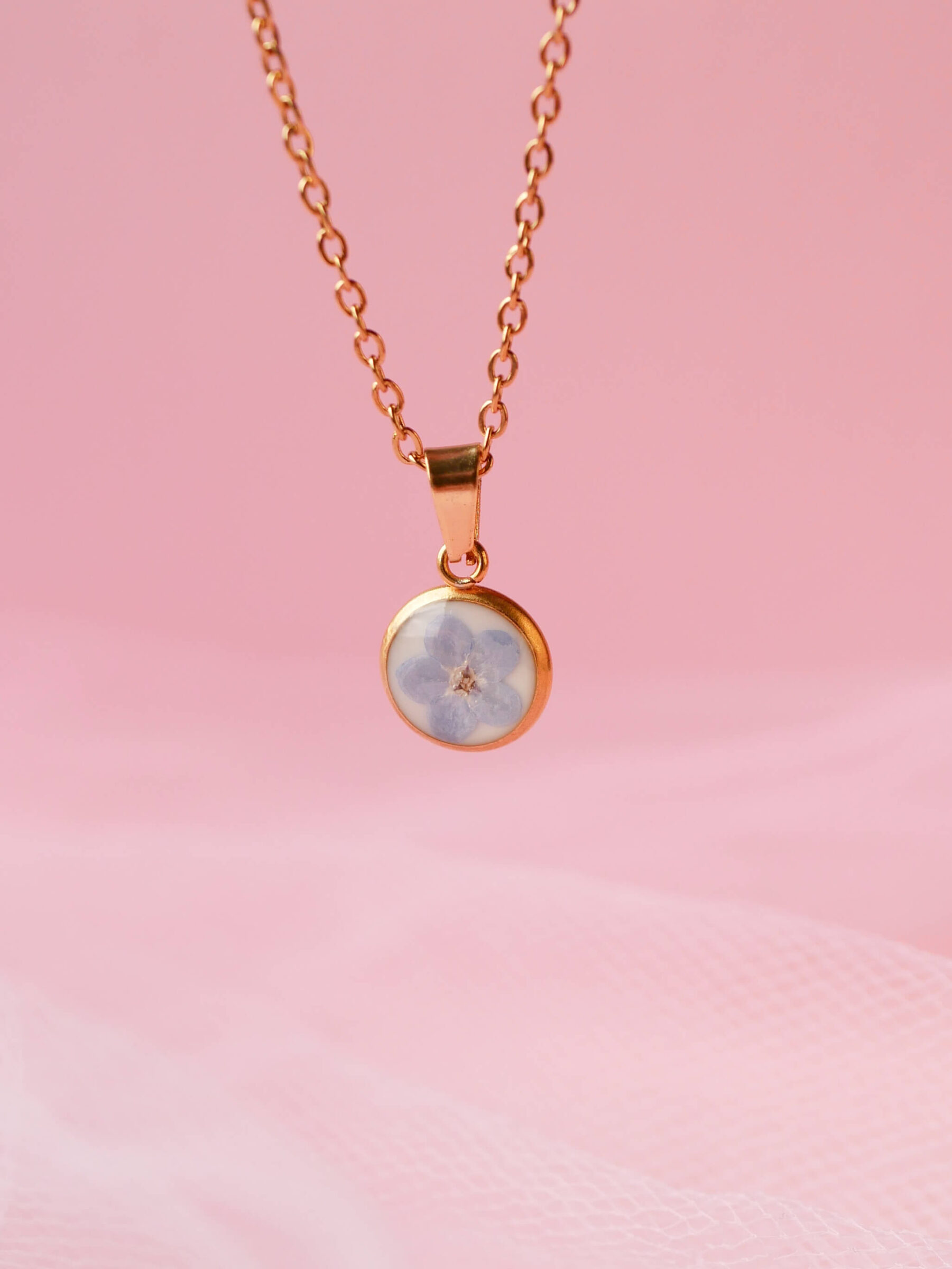 Naszyjnik w kształcie kropelki z niezapominajką na mlecznym tle.