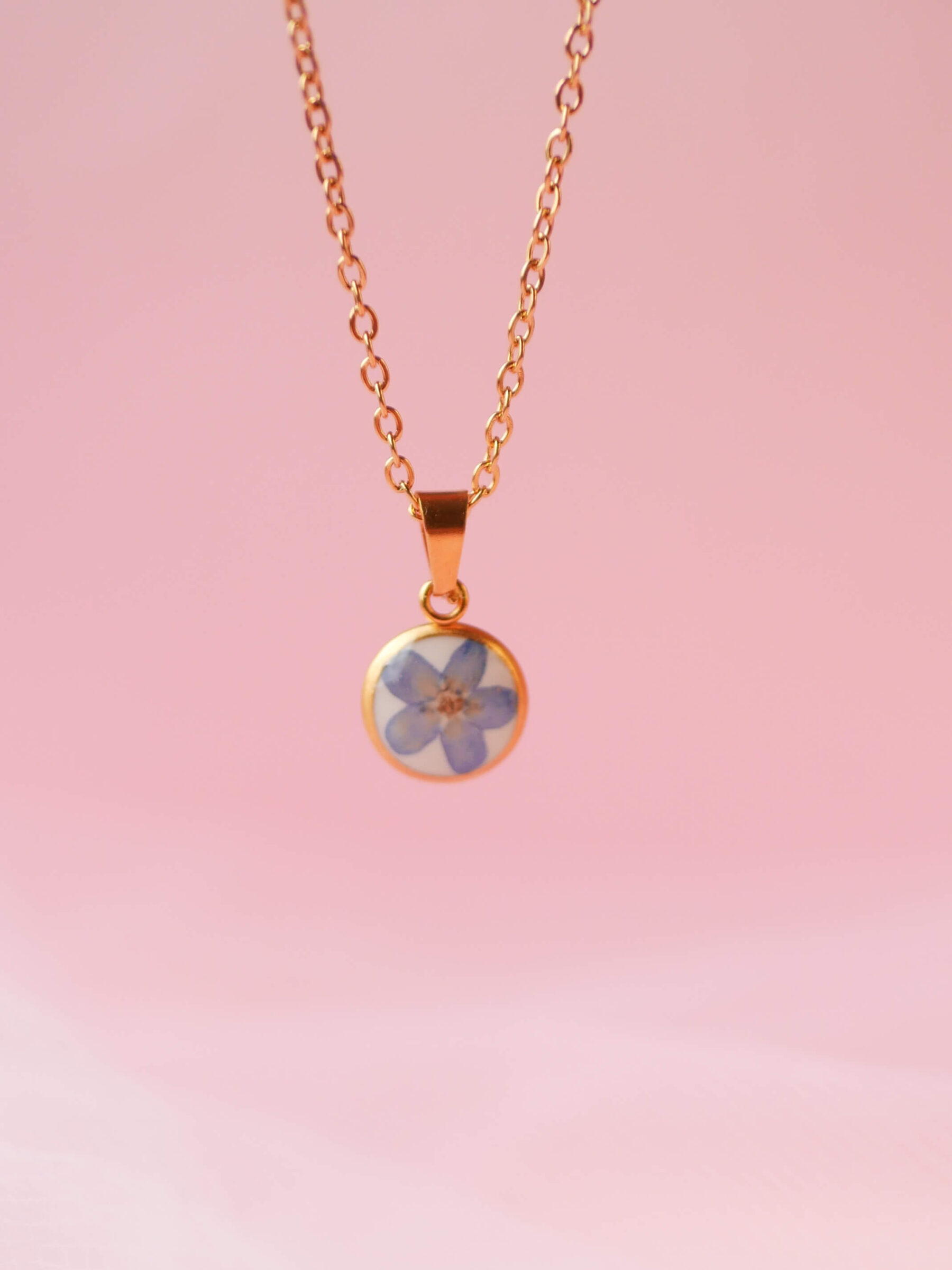 Naszyjnik w kształcie kropelki z niezapominajką na mlecznym tle.