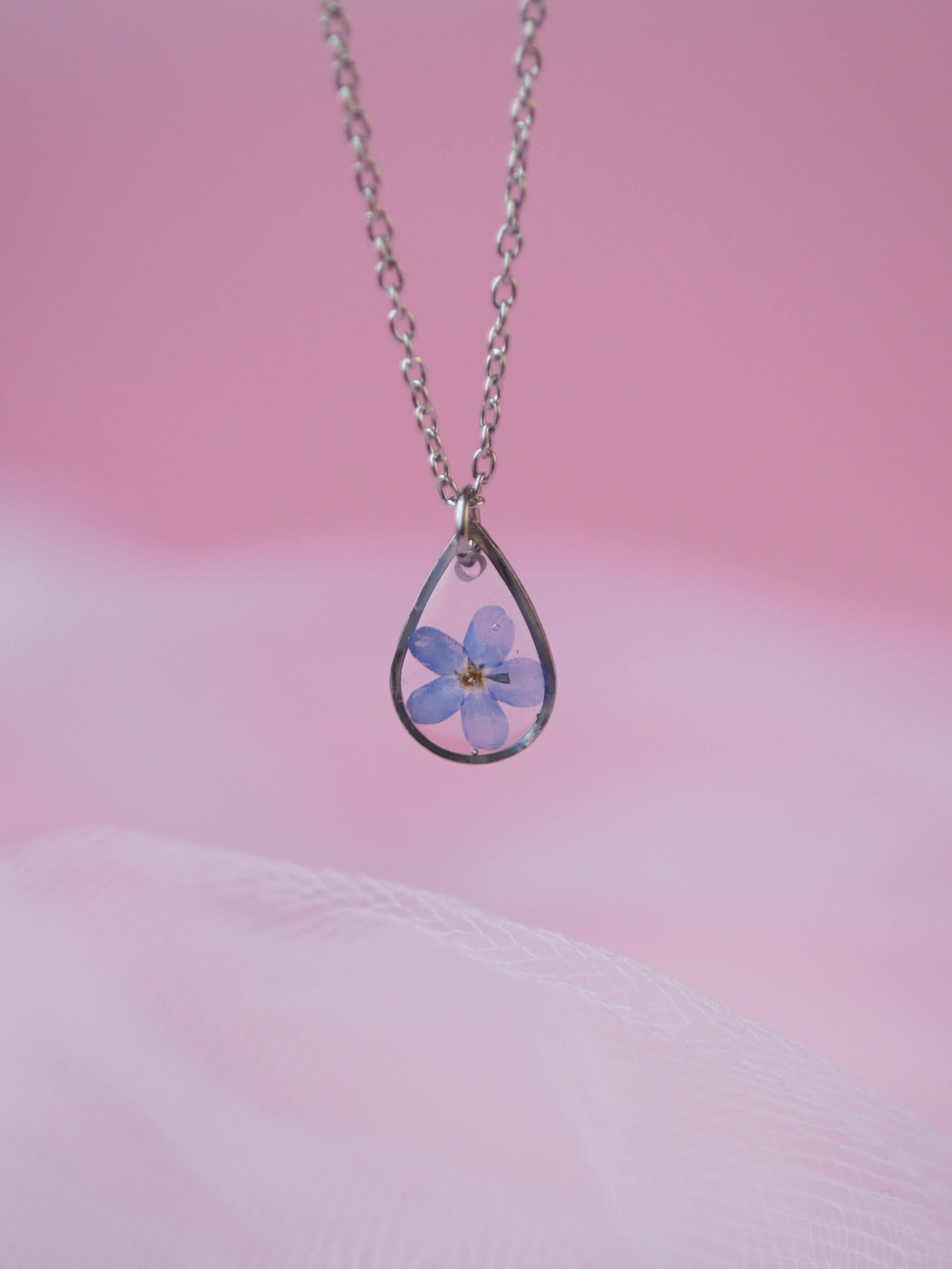 Naszyjnik w kształcie mini łezki z niezapominajką na przeźroczystym tle. Baza ze stali nierdzewnej w kolorze srebra.