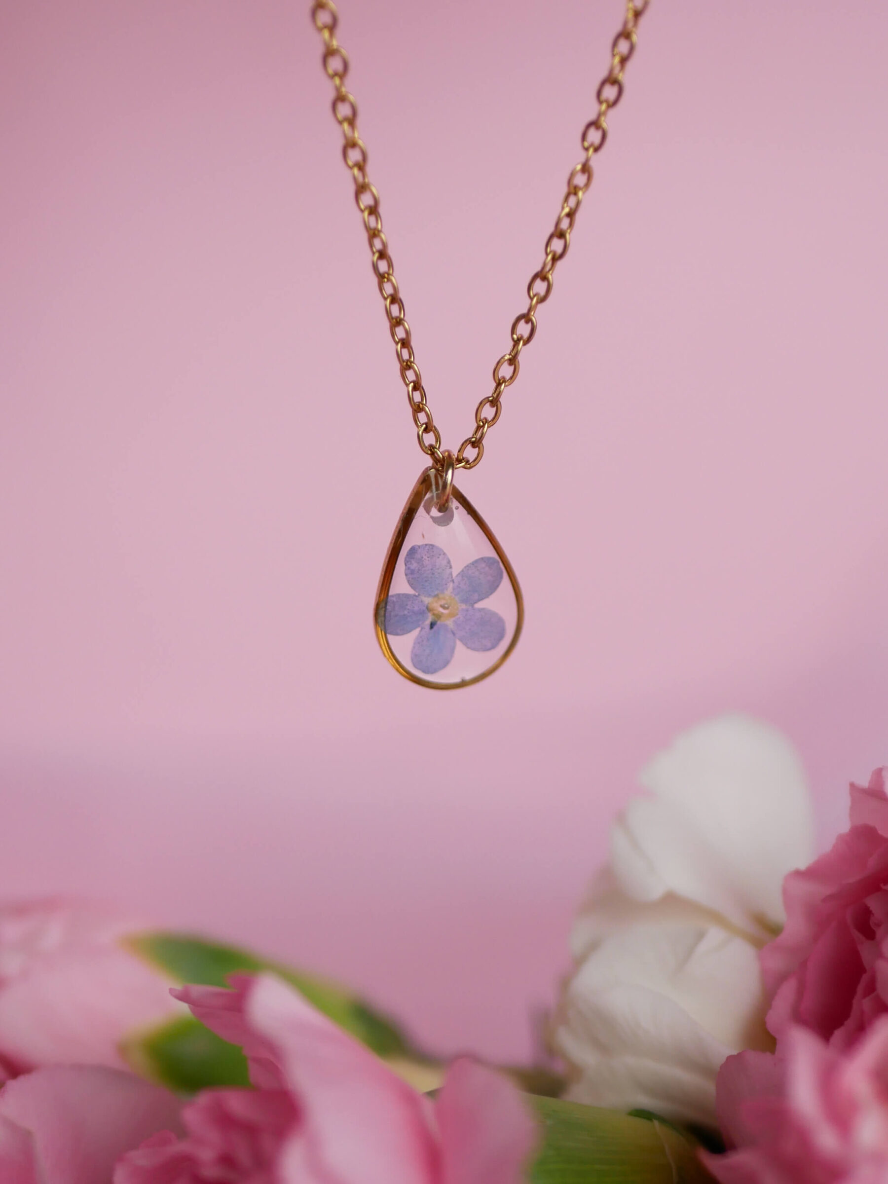 Naszyjnik w kształcie mini łezki z niezapominajką na przeźroczystym tle. Baza ze stali nierdzewnej w kolorze złota.