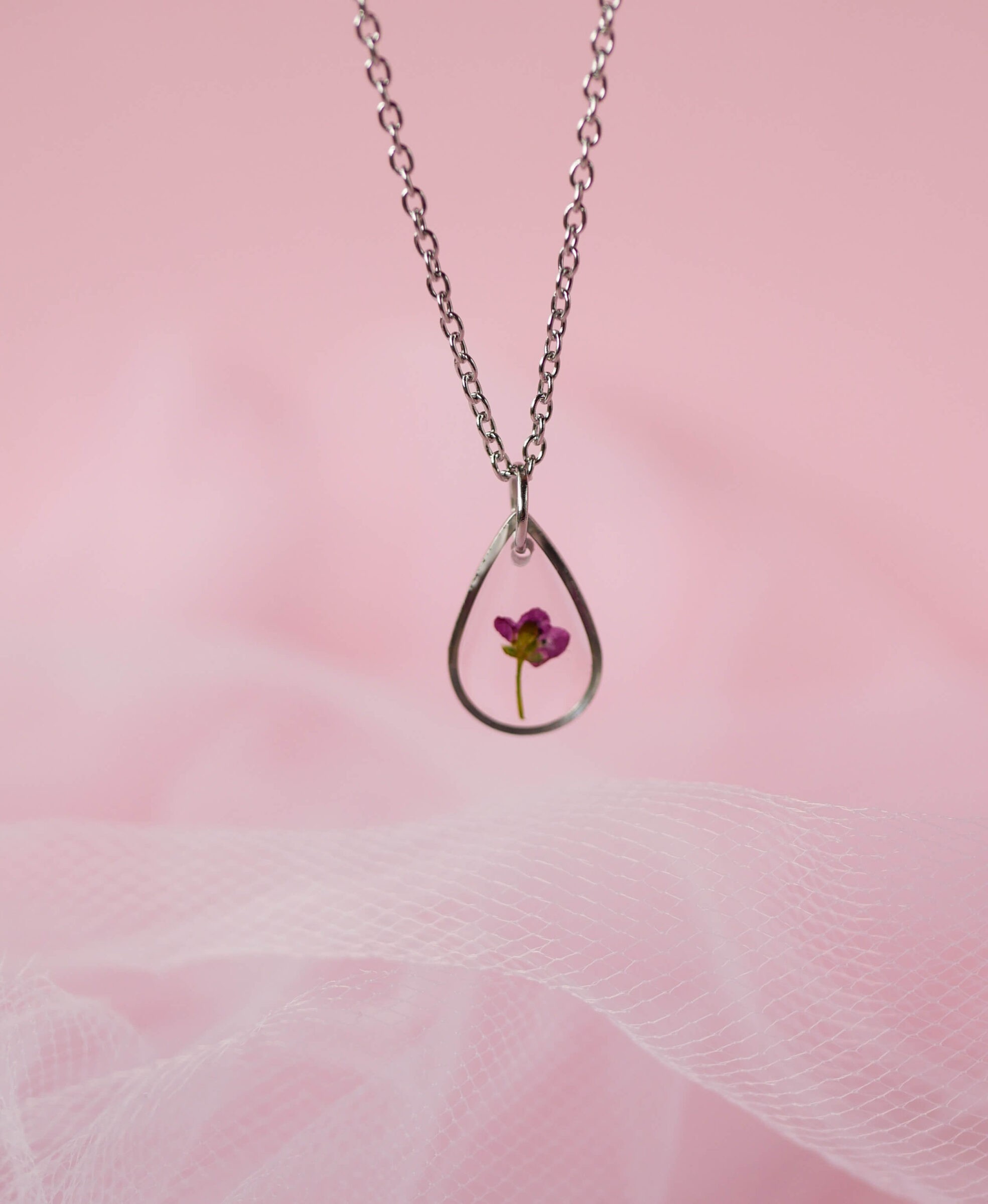 Naszyjnik w kształcie mini łezki z gałązką smagliczka na przeźroczystym tle. Baza ze stali nierdzewnej w kolorze srebra.