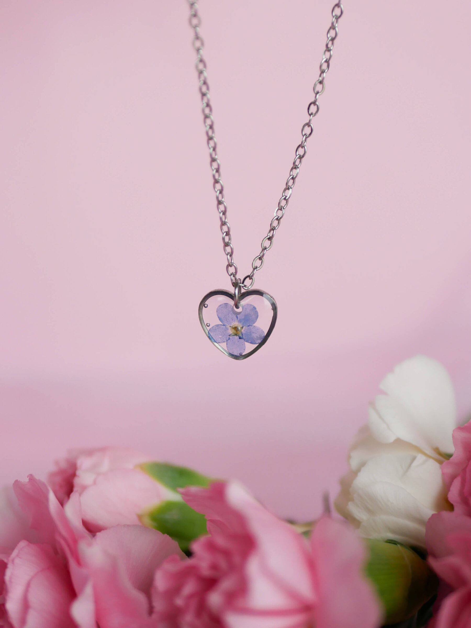 Naszyjnik w kształcie serca z niezapominajką na przeźroczystym tle. Baza ze stali nierdzewnej w kolorze srebra.