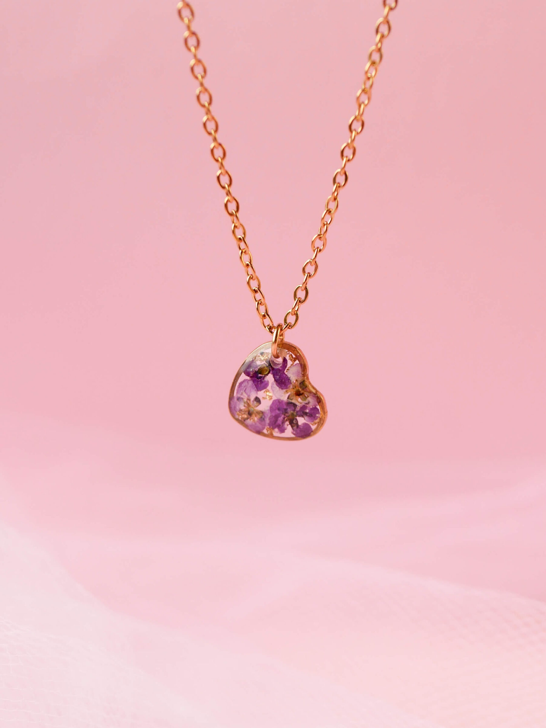 Naszyjnik w kształcie serca z kwiatami smagliczki na przeźroczystym tle z drobinkami złota. Baza ze stali nierdzewnej w kolorze złota.