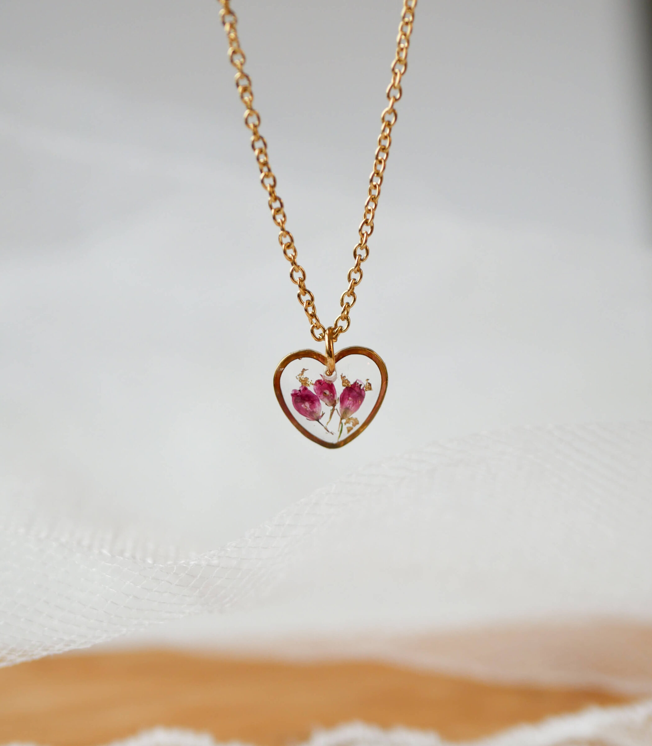 Naszyjnik serce z wrzoścem z drobinkami złota na  przeźroczystym tle. Baza ze stali nierdzewnej w kolorze złota.