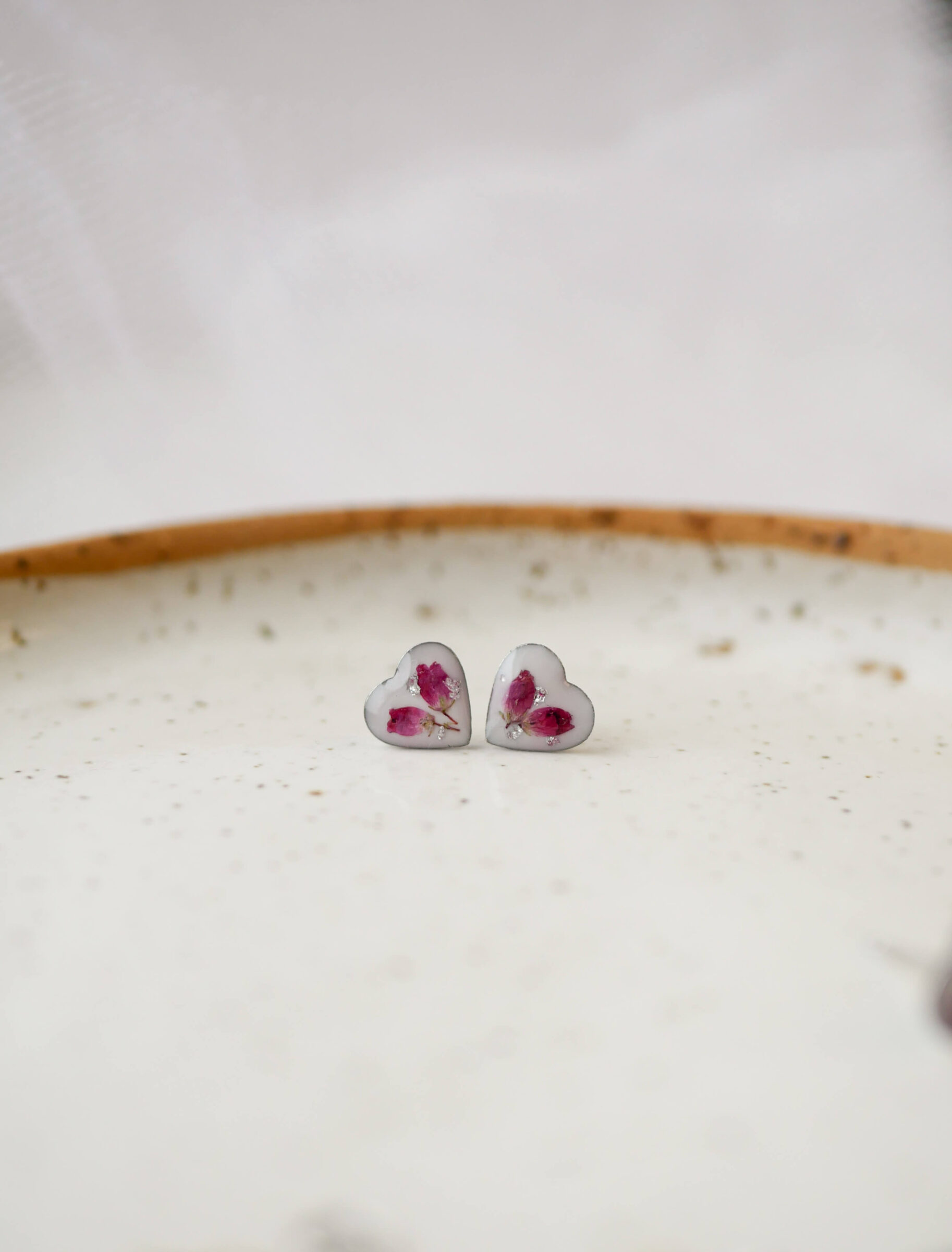 Kolczyki wkrętki mini serduszka z wrzoścem na mlecznym tle.