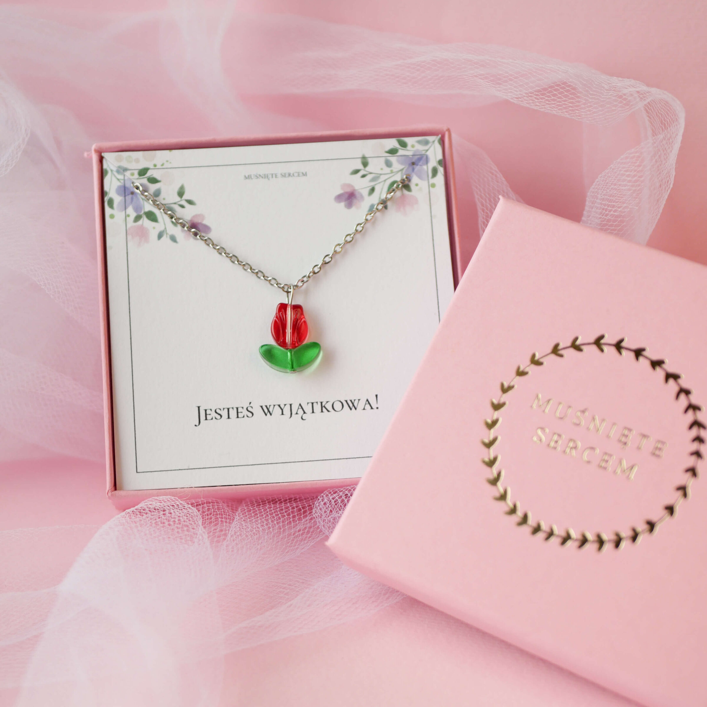 Naszyjnik z wysokiej jakości szklanych koralików w kształcie tulipana.