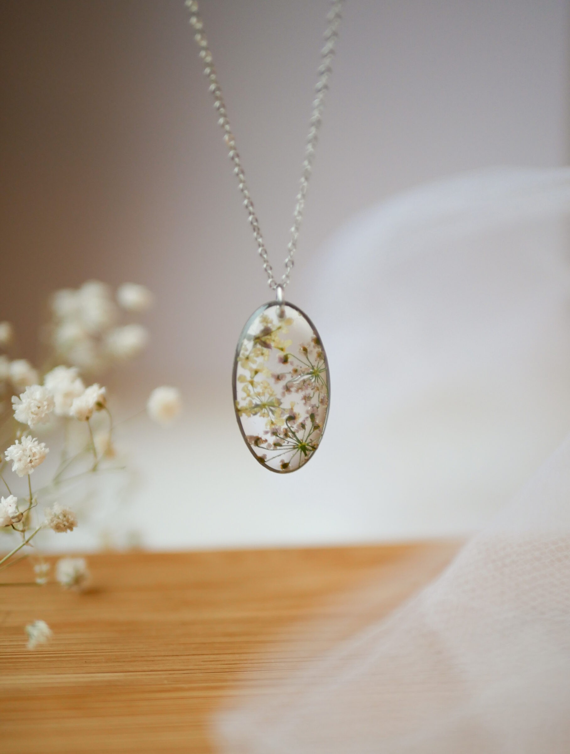 Naszyjnik w kształcie owalu z dziką marchwią na przeźroczystym tle. Baza ze stali nierdzewnej w kolorze srebra.