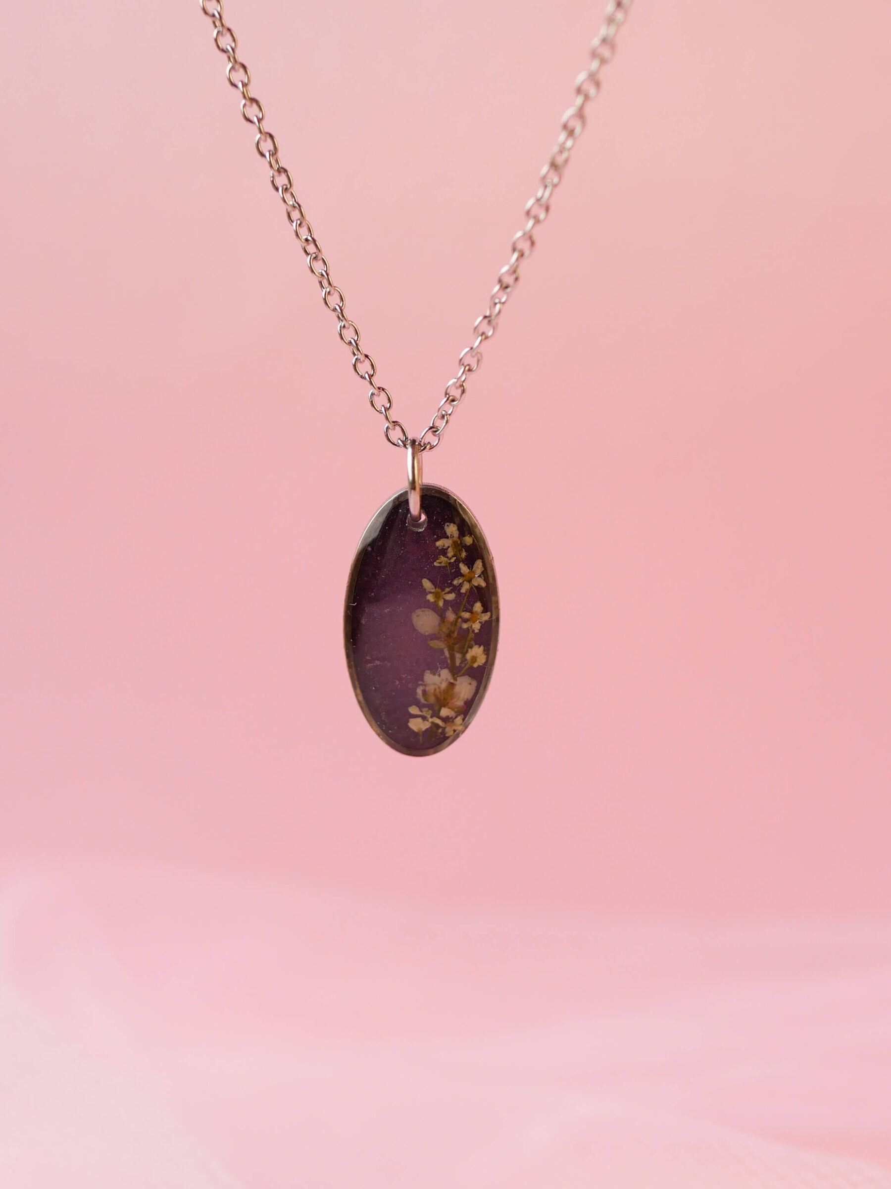 Naszyjnik w kształcie owalu z kwiatami dzikiej marchwi i smagliczki na ciemnym tle z perłową poświatą. Baza ze stali nierdzewnej w kolorze srebra.