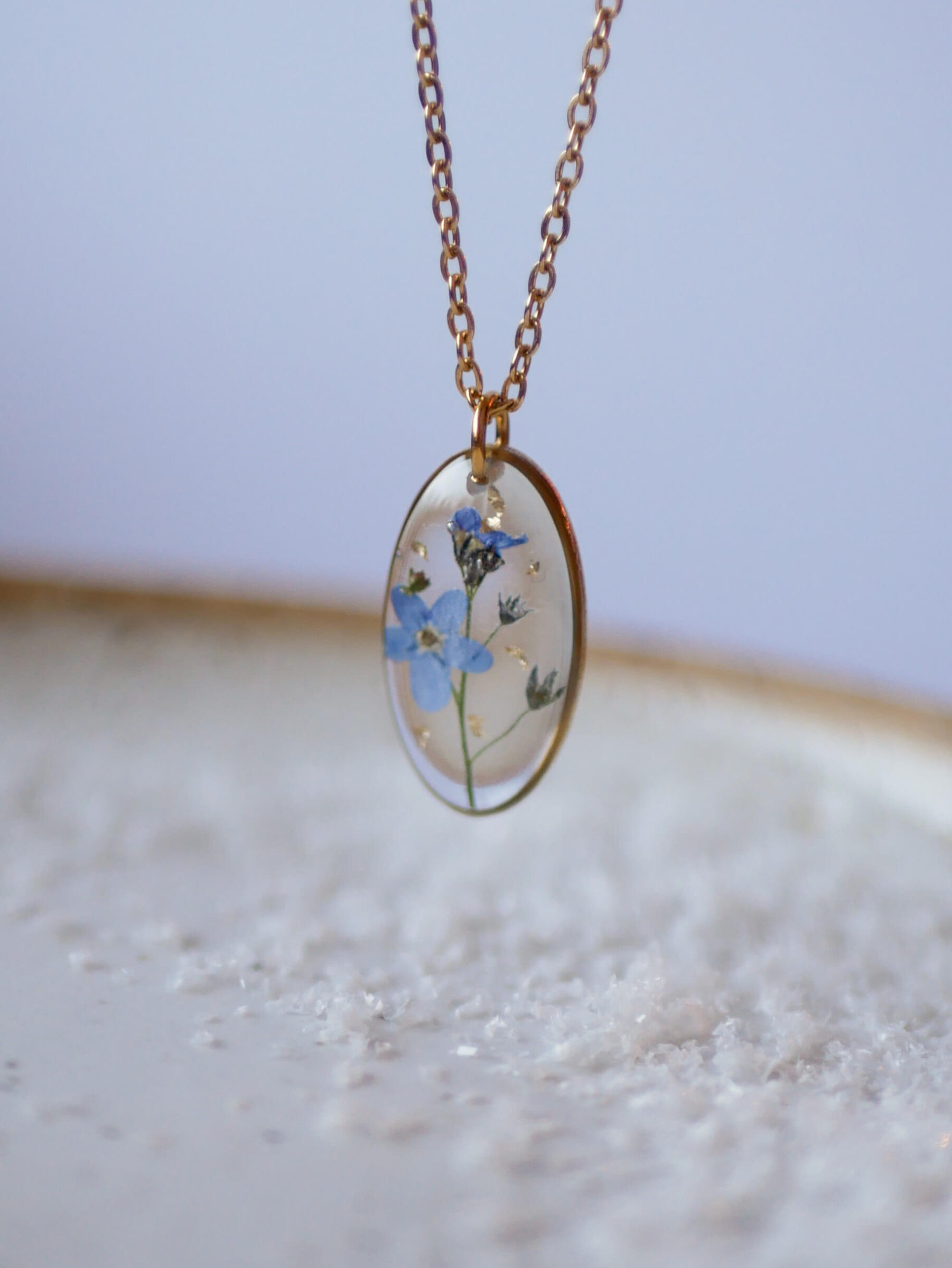 Naszyjnik w kształcie owalu z niezapominajką i drobinkami złota na przeźroczystym tle. Baza ze stali nierdzewnej w kolorze złota.