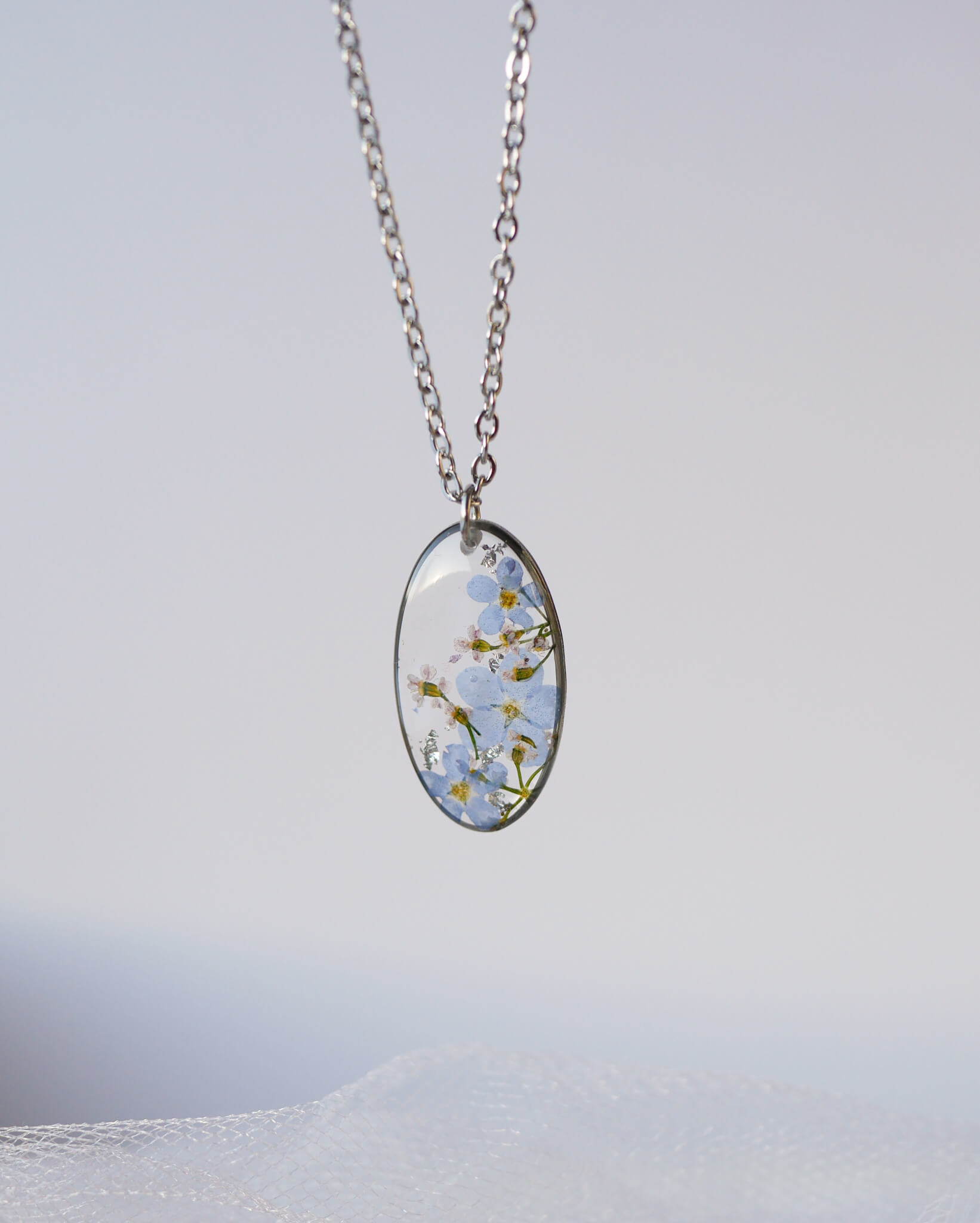 Naszyjnik w kształcie owalu z niezapominajką i dziką marchwią drobinkami srebra na przeźroczystym tle. Baza ze stali nierdzewnej w kolorze srebra