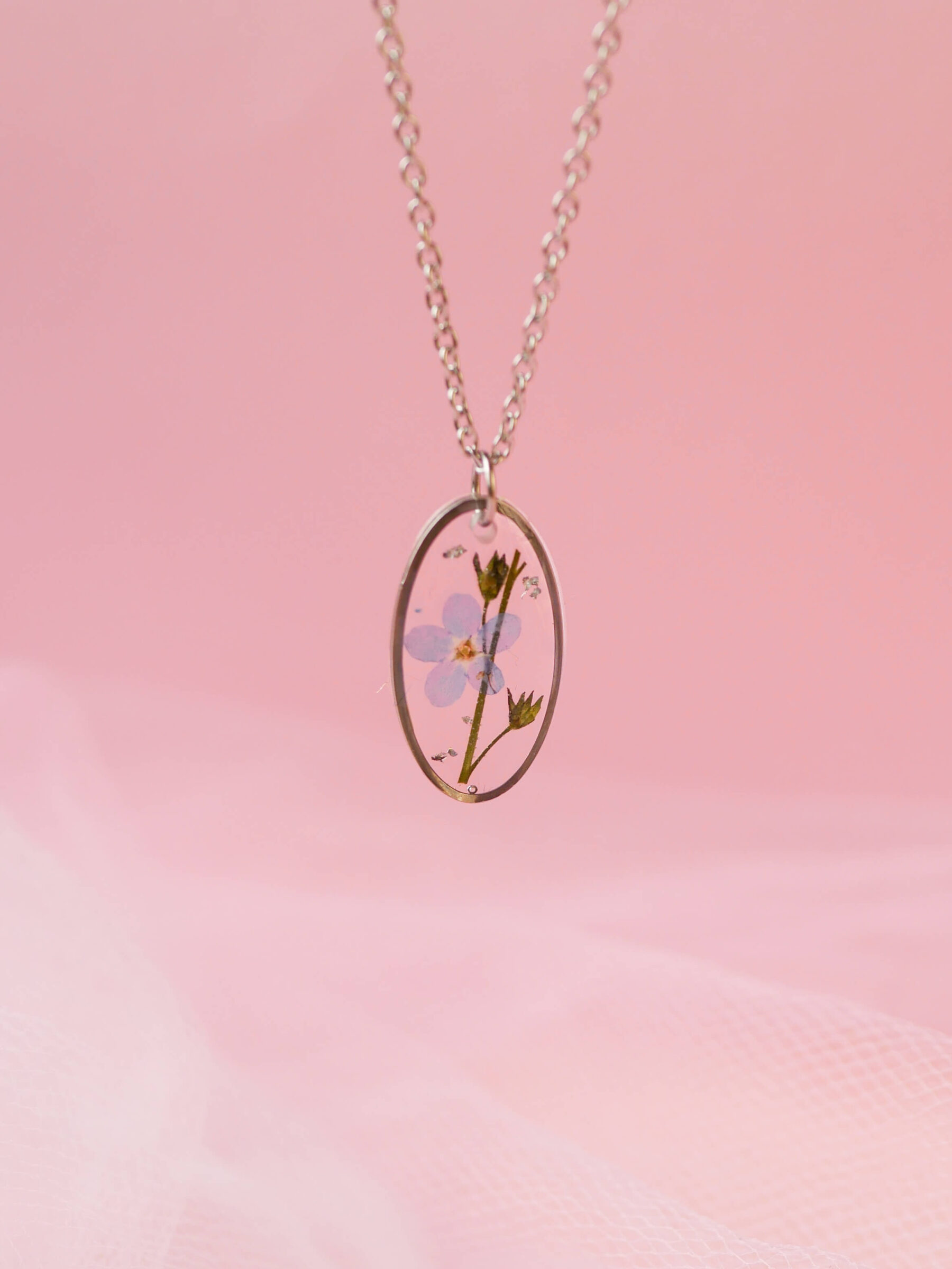 Naszyjnik w kształcie owalu z niezapominajką z na przeźroczystym tle z drobinkami srebra. Baza ze stali nierdzewnej w kolorze srebra.