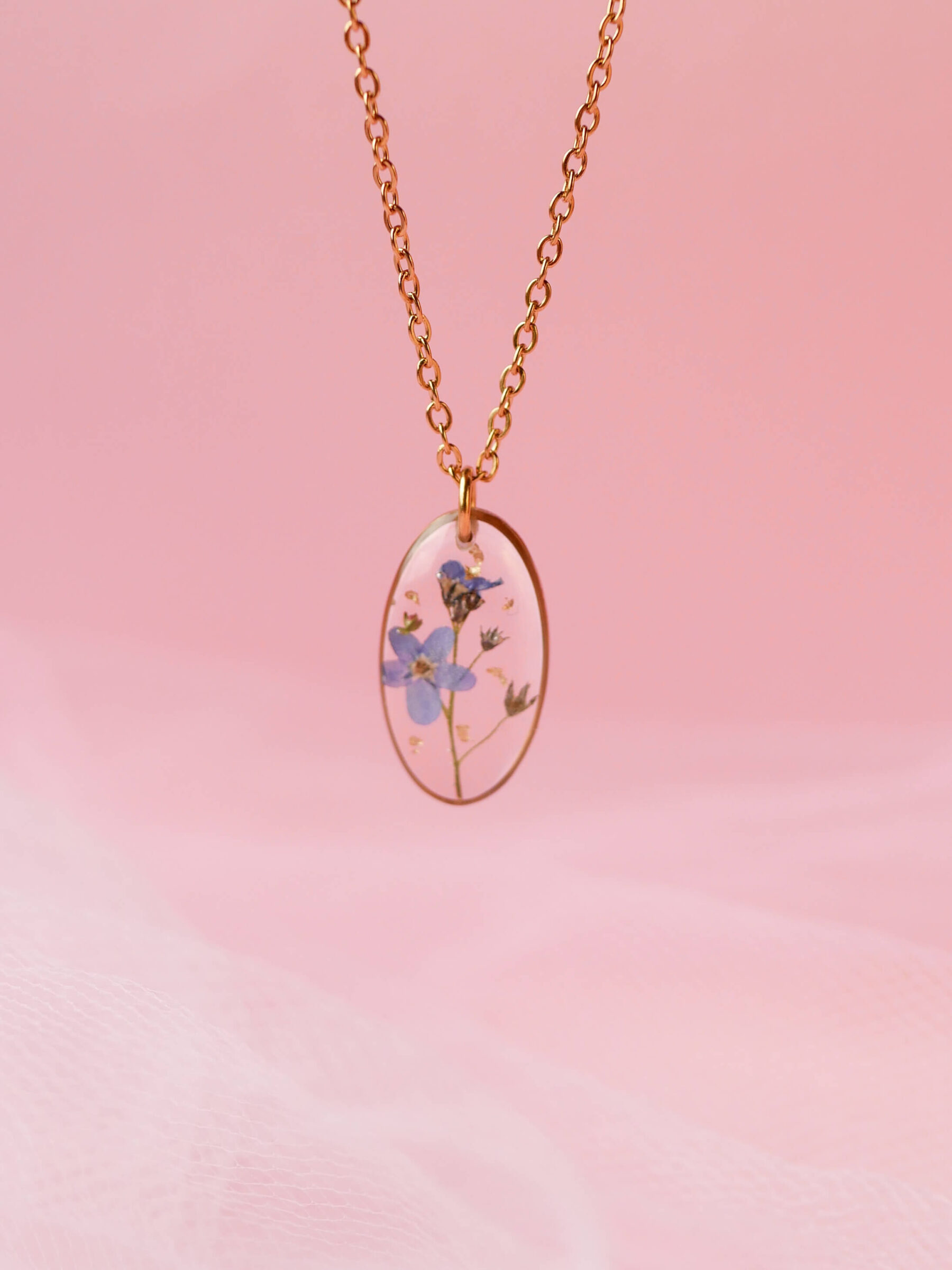 Naszyjnik w kształcie owalu z niezapominajką z drobinkami złota na przeźroczystym tle. Baza ze stali nierdzewnej w kolorze złota.